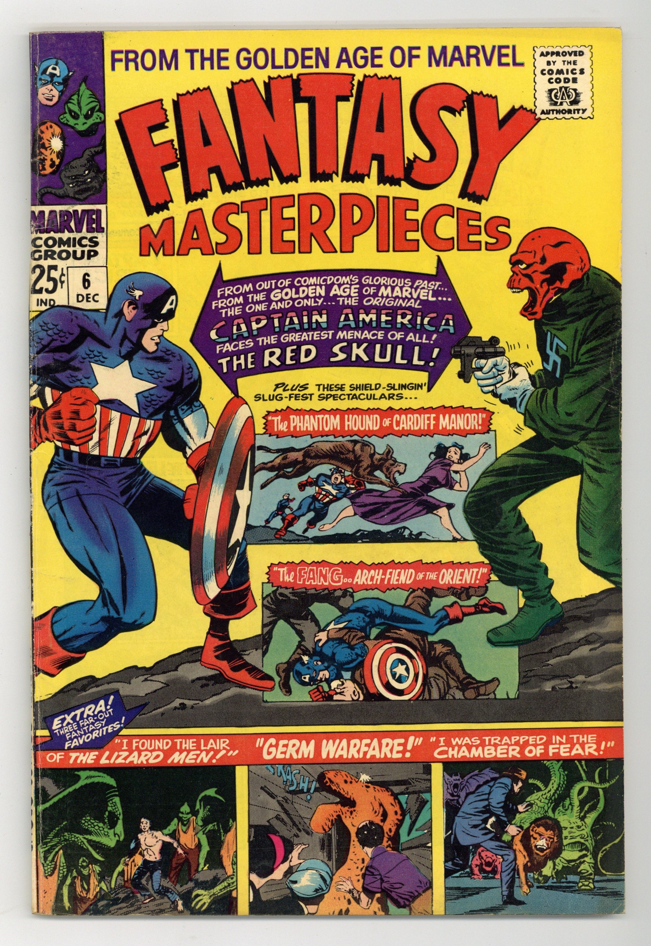 $8.80Cover pencils by Jack Kirby, Don Heck, and Paul Reinman (vignettes), inks by Vince Colletta, Don Heck, Paul Reinman, and Dick Ayers (vignettes). Reprints. "Captain America and the Red Skull" from Captain America Comics #7, script and pencils by Joe Simon and Jack Kirby, inks by Joe Simon; Cap has to contend with the return of the Red Skull and figure out why he is using Chopin's "Funeral March" as the means of his diabolical mission of destruction. "The Phantom Hound of Cardiff Moor" from Captain America Comics #10, , script and pencils by Joe Simon and Jack Kirby, inks by Joe Simon; Cap solves the mystery of Cardiff Manor and a "ghost" dog, used by the only living relative of the family that once owned the manor. "I Found the Lair of the Lizard Men" from Journey Into Mystery #64, art by Don Heck; A convict escapes and hides in a deep cave, where he finds a society of lizard men unable to breathe on the surface; When he tries to steal the diamond that provides their light he is transformed into a lizard man and forced to live among them as an outcast. "I Was Trapped In The Chamber Of Fear!" from Tales Of Suspense #33, pencils by Jack Kirby, inks by Dick Ayers; A man tries to pitch to Stan Lee the story of a blackmailer who becomes trapped within a mystic ruby as an agent of Fate to direct recently departed souls to their destination; Stan rejects the story as too outlandish even for Tales of Suspense and the man leaves the office. "Germ Warfare" from Strange Tales #90, art by Paul Reinman; A medical researcher working while on a boat with friends tries to enlarge a germ to more closely examine it, but it grows to human size and hijacks the boat; The doctor takes the germ to an island where it intends to enlarge an army of microbes to conquer the world. "Meet The Fang Arch Fiend Of The Orient from Captain America Comics #6, script and pencils by Joe Simon and Jack Kirby, inks by Joe Simon; Cap and Bucky battle against the evil Fang and Baron Nushima, who seek to prevent two emissaries from China from obtaining money loans from the American government. 68 pgs., full color. Cover price $0.25.