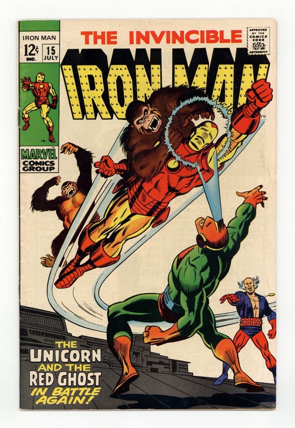 Tags: Marvel Legacy Numbering: Iron Man (part 15), Iron Man$21.00"Said the Unicorn to the Ghost!" Story by Archie Goodwin. Art by George Tuska and Johnny Craig. The Red Ghost has helped the Unicorn (last seen in Iron Man 4) regain his powers and sanity following his defeat at the hands of Iron Man several months ago. Now the deadly duo travels to the Nevada desert to steal Tony Stark's cosmic ray intensifier! However, Shell-head is there to stop them! It's a great battle among Iron Man, the Unicorn, the Red Ghost, and the Super Apes! Meanwhile, Cord Manufacturing is reopening with Janice Cord as chief executive and Alex Niven as head scientist. First appearance of Alex Niven (aka Crimson Dynamo). Last 12¢ issue. 32 pages Cover price $0.12.