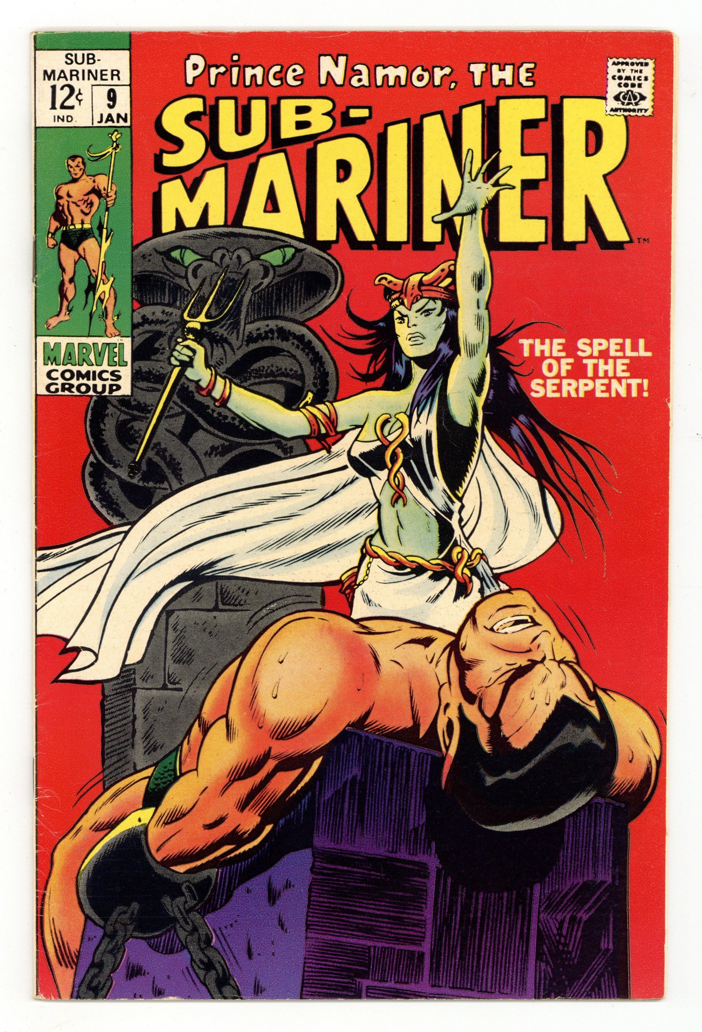 "The Spell of the Serpent!" Written by Roy Thomas. Art by Marie Severin and Dan Adkins. The sinister Serpent Crown has turned the citizens of Atlantis against their monarch. Even Lady Dorma falls under the thrall of the evil artifact. Can Namor's indomitable will stand against the mind numbing power of the Serpent Crown? "The Spell of the Serpent!" Tiger Shark cameo. NOTE: 1st appearance of the Serpent Crown. Cover price $0.12.