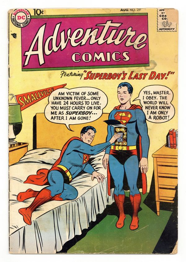 Cover pencils by Curt Swan, inks by Stan Kaye. Superboy's Last Day, script by Otto Binder, art by George Papp; flashback story in which Superboy meets kryptonite for the first time; Superboy's five robots are introduced. The Case of the Super-Arrows, script and pencils by Jack Kirby, inks by Jack Kirby and Roz Kirby (backgrounds); Green Arrow receives arrows from fans from the future but they are stolen by "Cougar Cain" and his men. A World without Water starring Aquaman, script by Joe Millard, art by Ramona Fradon. 36 pages, Full Color. Cover price $0.10.