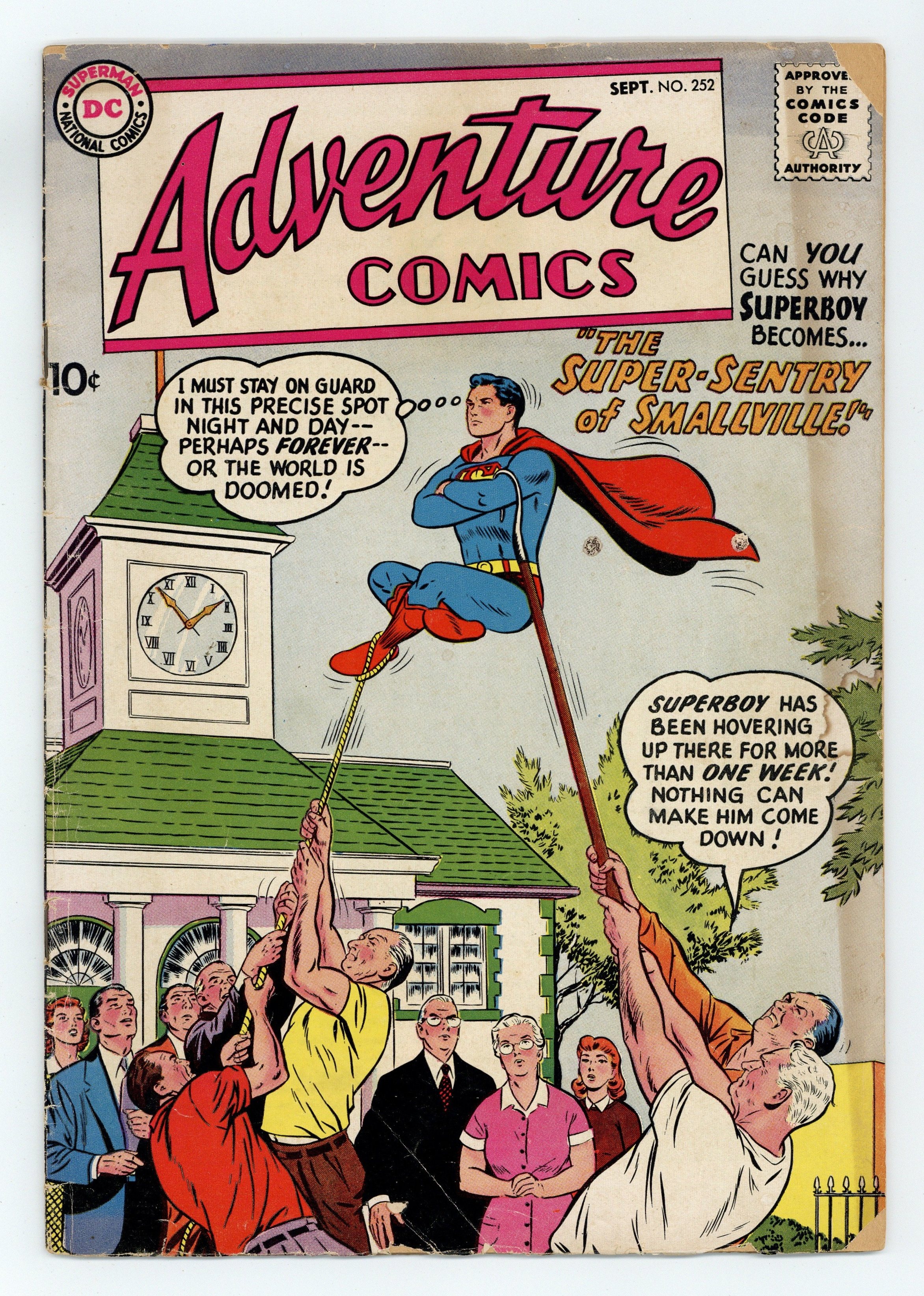 Cover pencils by Curt Swan, inks by Stan Kaye. The Super-Sentry of Smallville, script by Alvin Schwartz, art by John Sikela; to prevent the world from doom, Superboy must stay in the same spot. Varsity Vic humor page by Henry Boltinoff. The Mystery of the Giant Arrows, script by Ed Herron, pencils by Jack Kirby, inks by Jack Kirby and Roz Kirby; When Green Arrow and Speedy investigate giant arrows falling from the sky, they find themselves pulled into another dimension when an arrow they are examining is retrieved. The Robinson Crusoe of the Sea starring Aquaman, script by Jack Miller, art by Ramona Fradon. 36 pages, Full Color. Cover price $0.10.