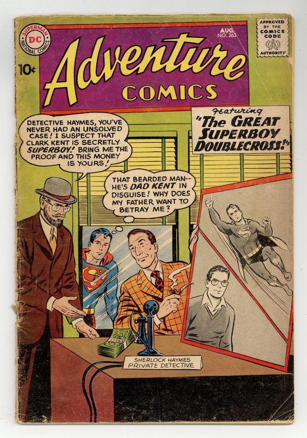 Cover pencils by Curt Swan, inks by Stan Kaye. The Great Superboy Doublecross, script by Otto Binder, art by John Sikela; Dad Kent hires a private detective to discover Superboy's secret identity. Have Arrow--Will Travel! starring Green Arrow, script by Robert Bernstein, art by Lee Elias; Speedy takes up odd-jobs to raise money for a sailboat; Some crooks try to take advantage of Speedy but he catches onto their scheme. The Great Ocean Election! starring Aquaman, art by Ramona Fradon. 36 pages, Full Color. Cover price $0.10.