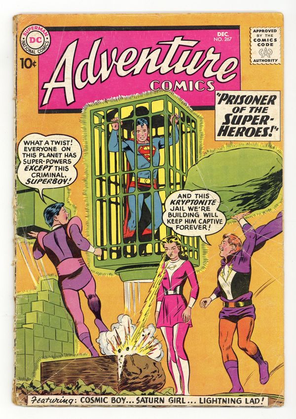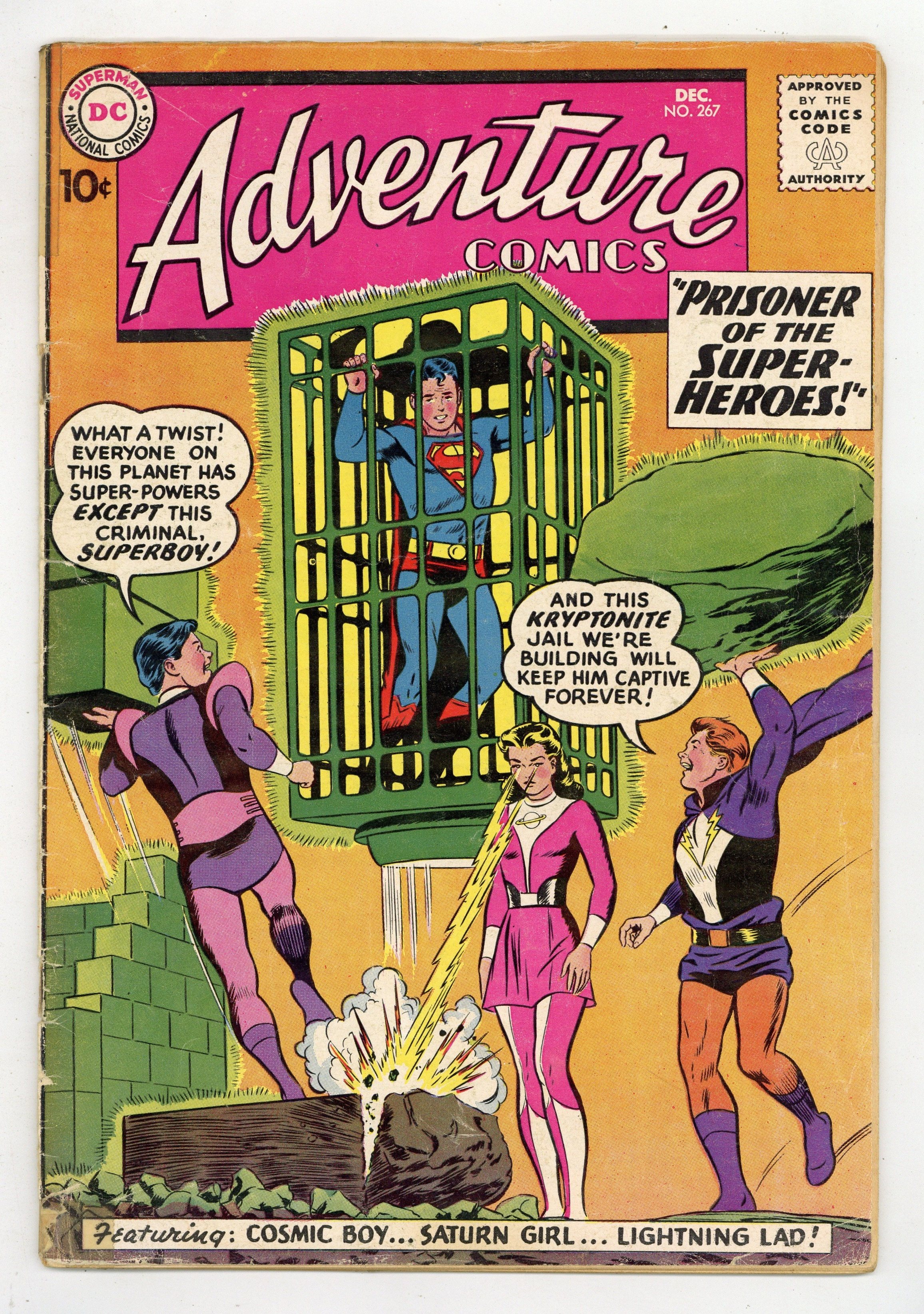 Cover pencils by Curt Swan, inks by Stan Kaye. Prisoner of the Super-Heroes, script by Jerry Siegel, art by George Papp; The Legion returns to 20th Century to discredit Superboy and exile him from Earth. The Manhunt On Land!, script by Robert Bernstein, art by Ramona Fradon; The Shark and The Wizard escape from jail; The Shark decides to operate on land but Aquaman captures him anyway. The Underwater Archers! starring Green Arrow, script by Robert Bernstein, art by Lee Elias; this is part two of the Aquaman story. 36 pages, Full Color. NOTE: 2nd appearance of Legion of Super-Heroes. Cover price $0.10.