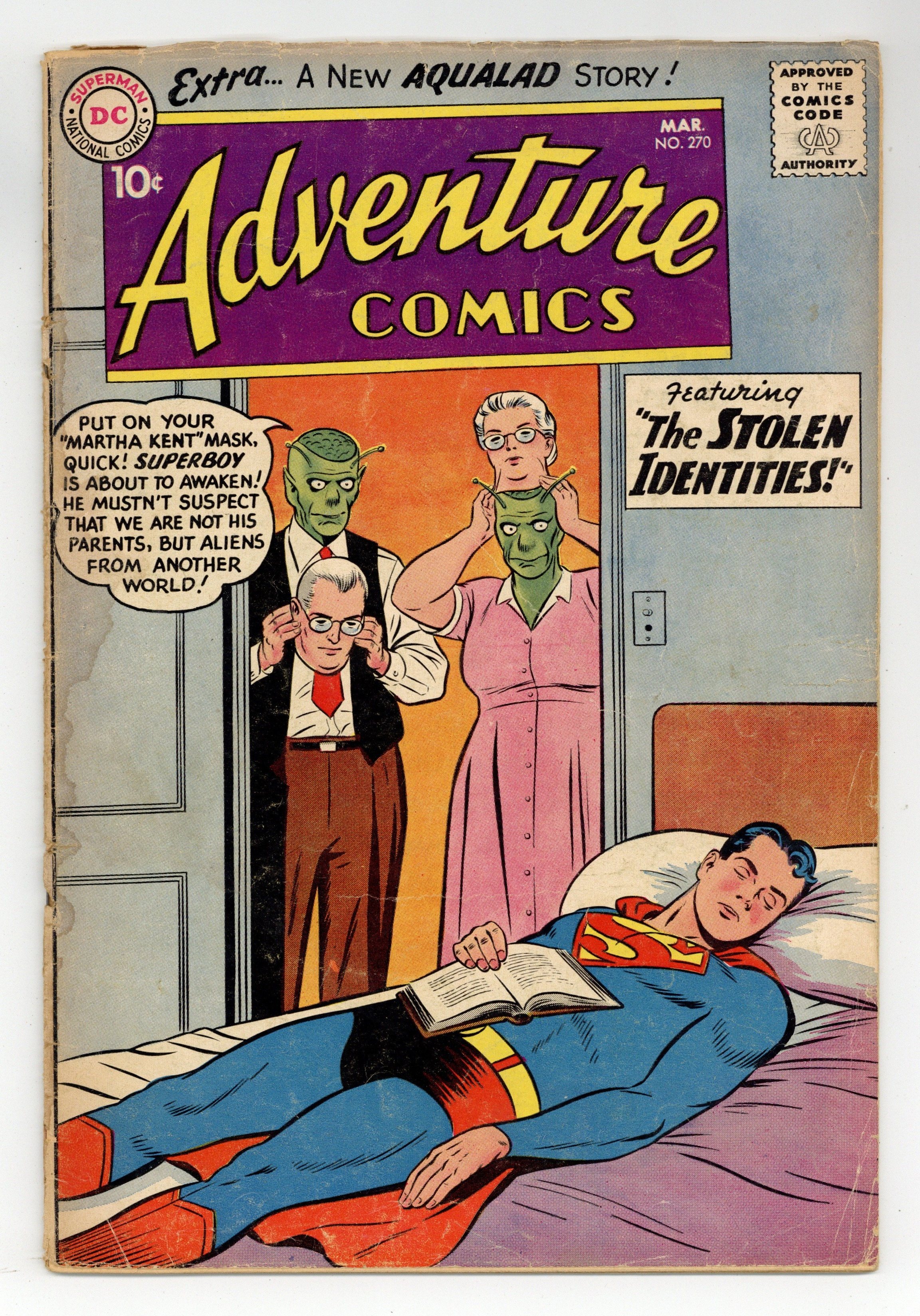 Starts Apr 27 Cover pencils by Curt Swan, inks by Stan Kaye. The Stolen Identities, script by Jerry Siegel, art by George Papp; Two Xelthunians secretly replace Ma and Pa Kent to perform a secret mission, not knowing that the Kents are Superboy's foster parents; After Ma Kent unwisely mentions Superboy's vulnerability to kryptonite, the Xelthunians power the transporter ray they plan to use to send Superboy to their planet with red kryptonite and it turns him into a fat Boy of Steel, a bullet-sized Boy of Steel, and a giant Boy of Steel. The Ninth Wonder starring Congorilla, script by Robert Bernstein, art by Howard Sherman; In his Adventure Comics debut, Congorilla stops river pirates, frees a kidnapped scientist, and stops an attack by the Wambus, all before a retelling of his origin. Casey the Cop humor page by Henry Boltinoff. The Menace of Aqualad! starring Aquaman, script by Robert Bernstein, art by Ramona Fradon. 36 pages, Full Color. Cover price $0.10.