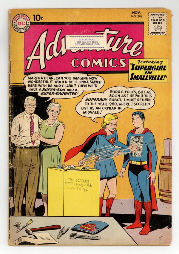 Cover pencils by Curt Swan, inks by Stan Kaye. Supergirl in Smallville!, script by Otto Binder, art by Al Plastino; Supergirl flies to Superboy's time to see if she can protect her identity and prove to Superman she's ready to be revealed to the world. Ollie humor page by Henry Boltinoff. Janu of the Apes, script by Robert Bernstein, art by Howard Sherman; Janu borrows Congo Bill's ring. Playful Pop humor page by Phil Berube. Aqualad Goes To School!, art by Ramona Fradon. 36 pages, Full Color. Cover price $0.10.