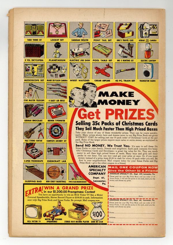 $26.00Cover pencils by Curt Swan, inks by Stan Kaye. Supergirl in Smallville!, script by Otto Binder, art by Al Plastino; Supergirl flies to Superboy's time to see if she can protect her identity and prove to Superman she's ready to be revealed to the world. Ollie humor page by Henry Boltinoff. Janu of the Apes, script by Robert Bernstein, art by Howard Sherman; Janu borrows Congo Bill's ring. Playful Pop humor page by Phil Berube. Aqualad Goes To School!, art by Ramona Fradon. 36 pages, Full Color. Cover price $0.10.
