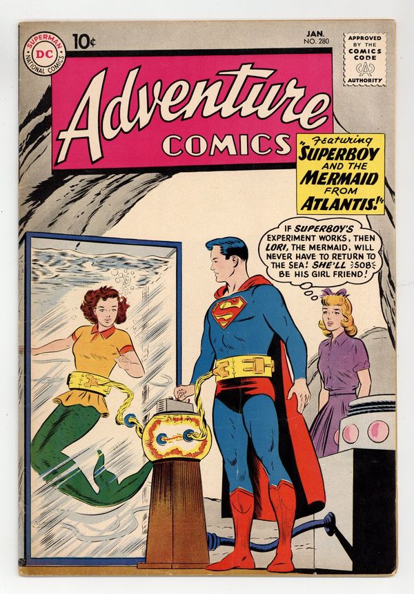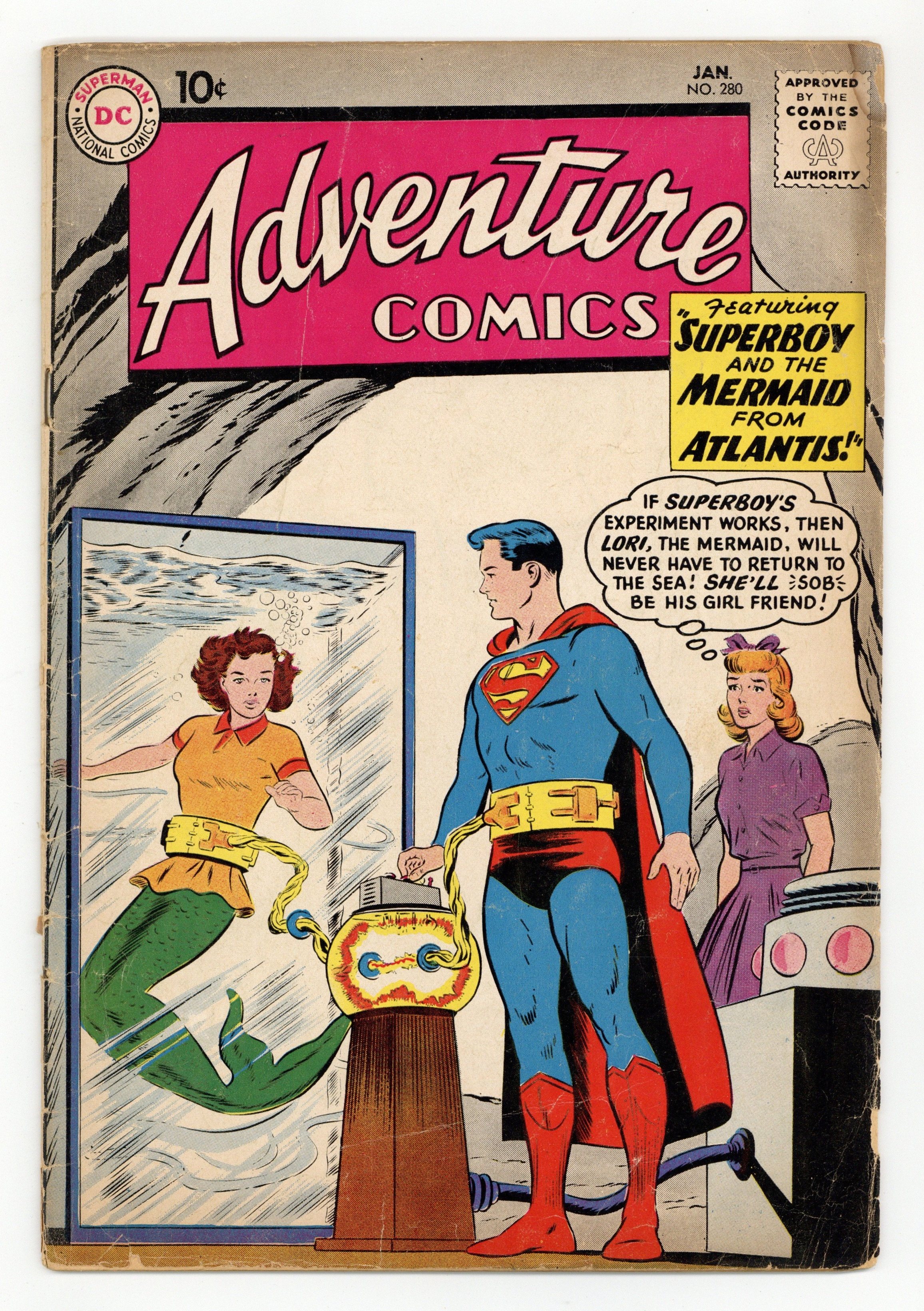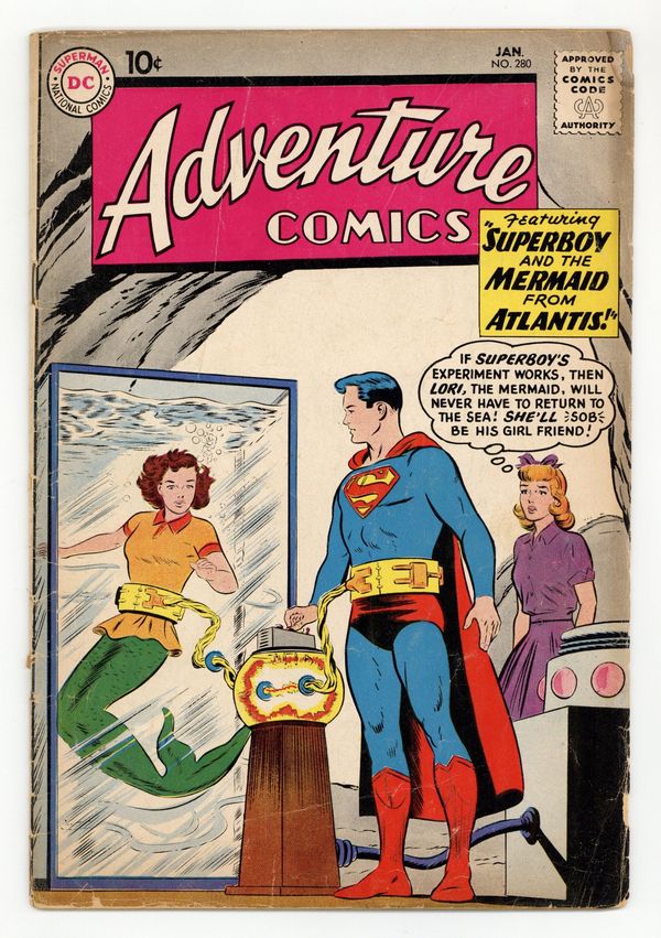 Cover pencils by Curt Swan. Superboy and the Mermaid from Atlantis, script by Jerry Siegel, pencils by Curt Swan, inks by John Forte; Superboy meets Lori Lemaris as a teenager. House ad for Superman Annual #2. Seven Faces of Congorilla, script by Robert Bernstein, art by Howard Sherman; Dizziness makes Congorilla act out nursery rhyme. The Lost Ocean!, script by Robert Bernstein, art by Ramona Fradon; Aquaman and Aqualad help make TV movie Sea Chase after the two stars get the bends after diving to deep; Sea Chase is a parody of the TV series Sea Hunt. 36 pages, Full Color. Cover price $0.10.