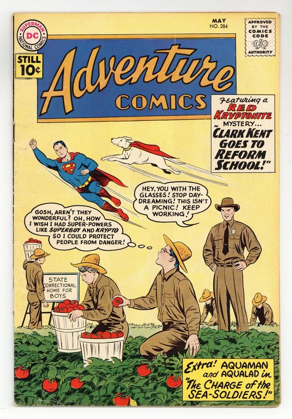 $47.50Cover pencils by Curt Swan, inks by Stan Kaye. Clark Kent Goes to Reform School, pencils by Curt Swan; Red K makes Clark Kent forget he's Superboy. The Charge of Aquaman's Sea Soldiers, script by Jack Miller, art by Jim Mooney; Aquaman and Aqualad stop Professor Enos Snark who is supplying pirates with technology to help them to rob ships. 36 pages, Full Color. Cover price $0.10.