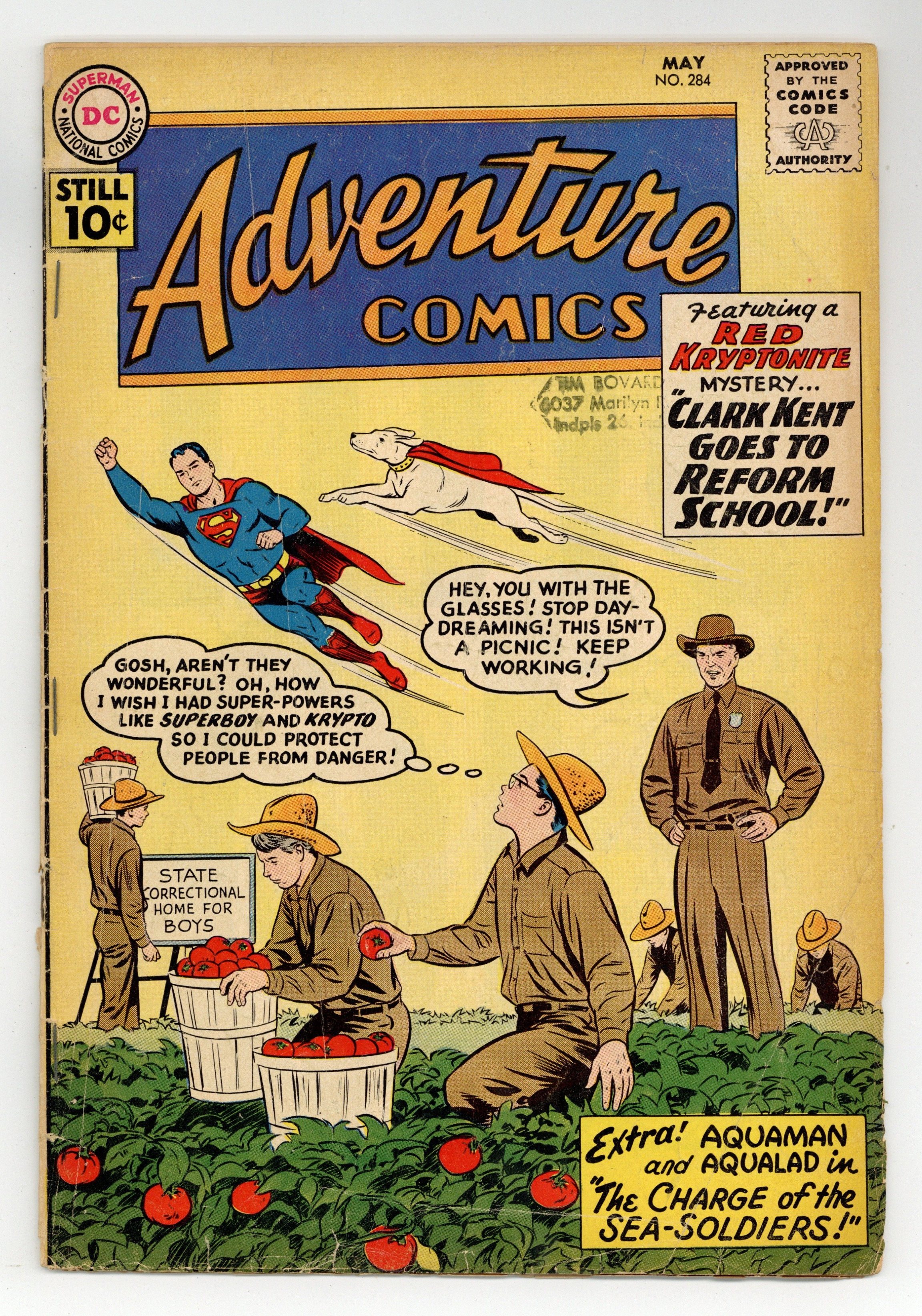 Cover pencils by Curt Swan, inks by Stan Kaye. Clark Kent Goes to Reform School, pencils by Curt Swan; Red K makes Clark Kent forget he's Superboy. The Charge of Aquaman's Sea Soldiers, script by Jack Miller, art by Jim Mooney; Aquaman and Aqualad stop Professor Enos Snark who is supplying pirates with technology to help them to rob ships. 36 pages, Full Color. Cover price $0.10.
