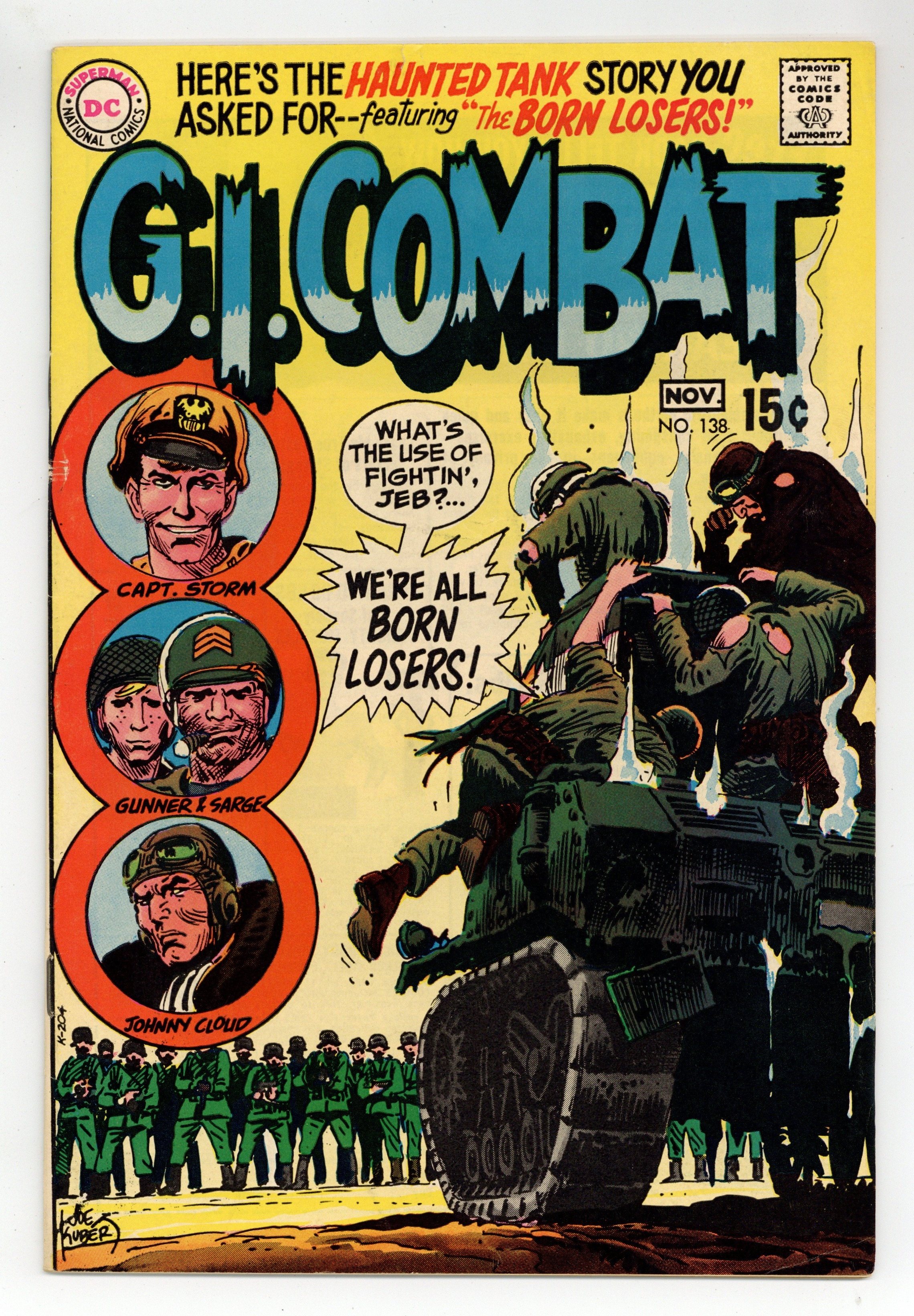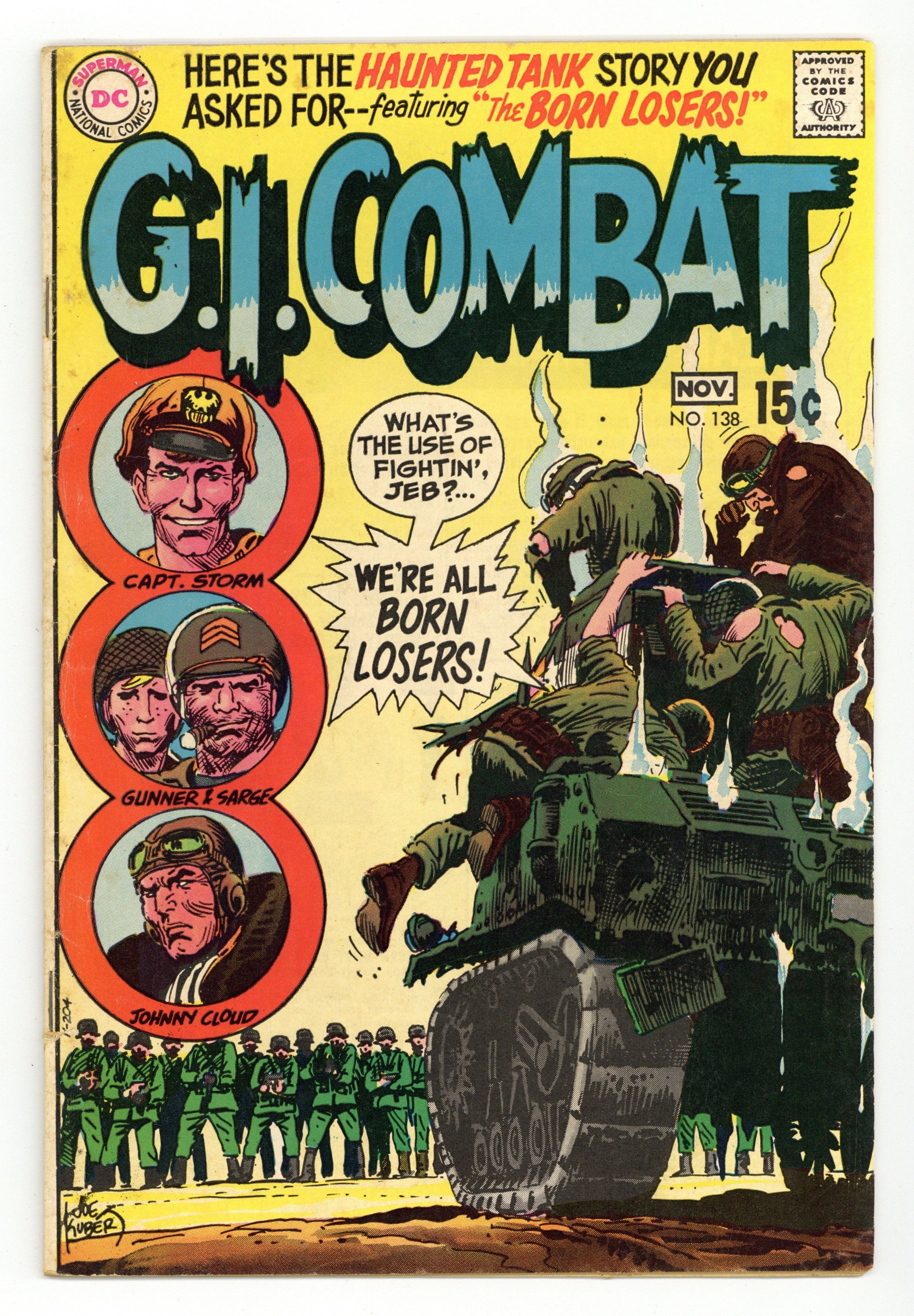 Cover by Joe Kubert. Written by Robert Kanigher and unknown. Art by Russ Heath, Joe Kubert, George Evans and Ken Barr. It's the first appearance of the Losers in the Haunted Tank story "The Losers" by Robert Kanigher and Russ Heath with Joe Kubert. Starring the Haunted Tank, Jeb Stuart, General J.E.B. Stuart, Arch Asher, Rick Rawlins, Slim Stryker and the Losers [Captain Storm, Gunner, Sarge, Johnny Cloud] (introduction as a team). Plus: "Bright Banner," with art by George Evans. And: Warrior 1-pager "Genghis Khan," with art by Ken Barr. 36 Pages, Full Color. Cover price $0.15.