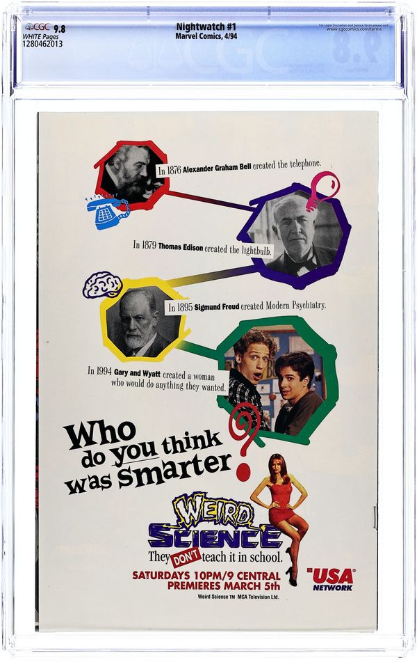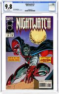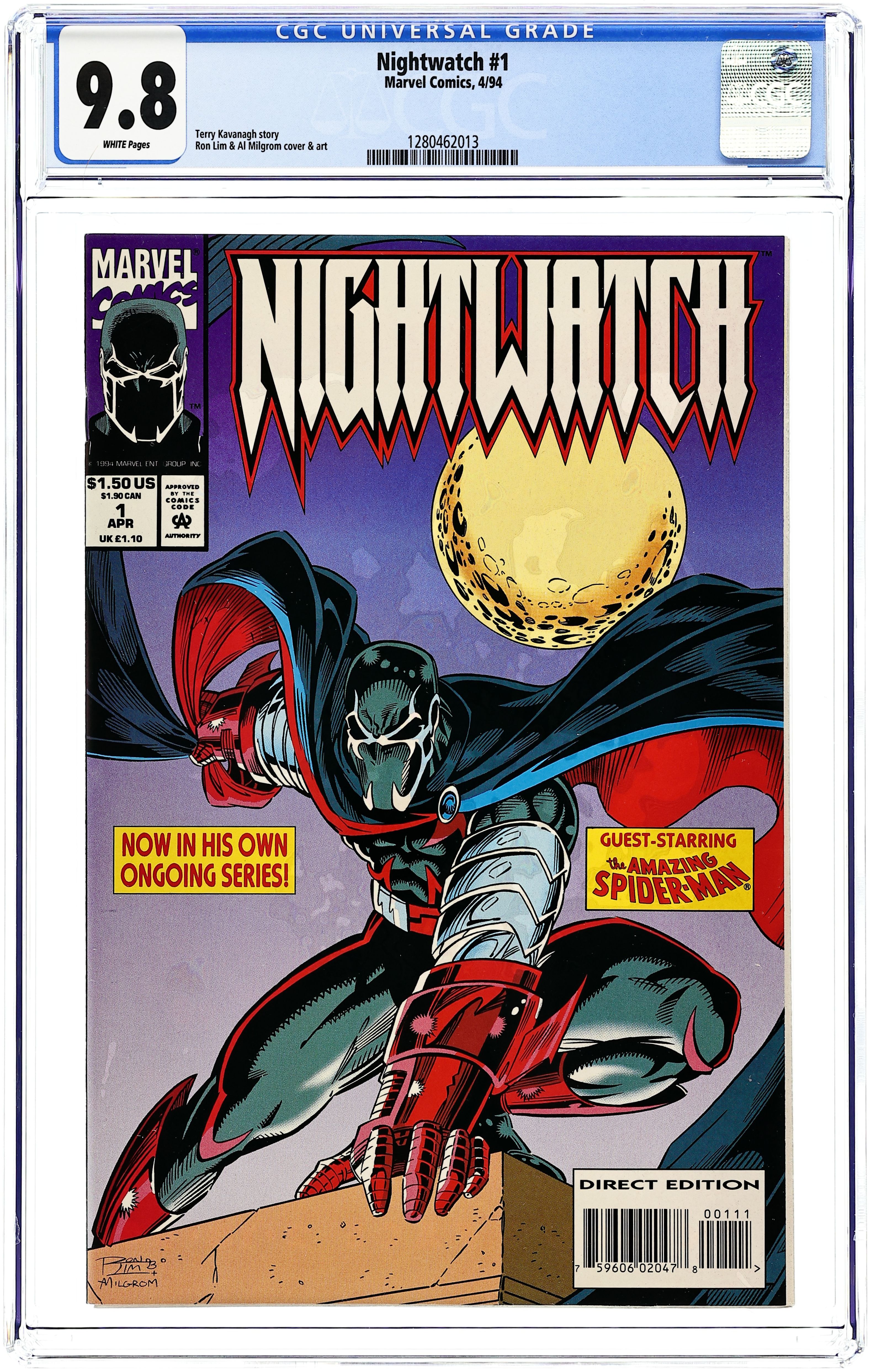 Direct Edition without foil enhancement. Cover pencils by Ron Lim, inks by Al Milgrom. "Life on the Edge," script by Terry Kavanagh, pencils by Ron Lim, inks by Al Milgrom; Web Of Spider-Man supporting character, Nightwatch, debuts in his first true clash with Spider-Man, and tackling a major new villian; After ten years of self-imposed exile, Nightwatch returns to New York to complete the cycle of his catastrophic legacy in this new monthly series; The mysterious Nightwatch, covered in perpetual darkness by his powerful costume, seeks answers to his origin and the loss of his long-lost love; Ten years ago, Dr. Kevin Trench mysteriously came to possess the powerful Nightwatch costume; Failing to save his love from a plane hijack, Dr. Trench hid from the world on a desolate island; His road to discovery begins with a search for the truth to his past, which happens to be our future; Standing in his way is a vicious new enemy, hell bent on keeping him from discovering the facts. Nightwatch llustration, pencils by Ron Lim, inks by Al Milgrom; Original cover design for the issue before they changed Nightwatch's costume. 36 pgs., full color. Cover price $1.50.