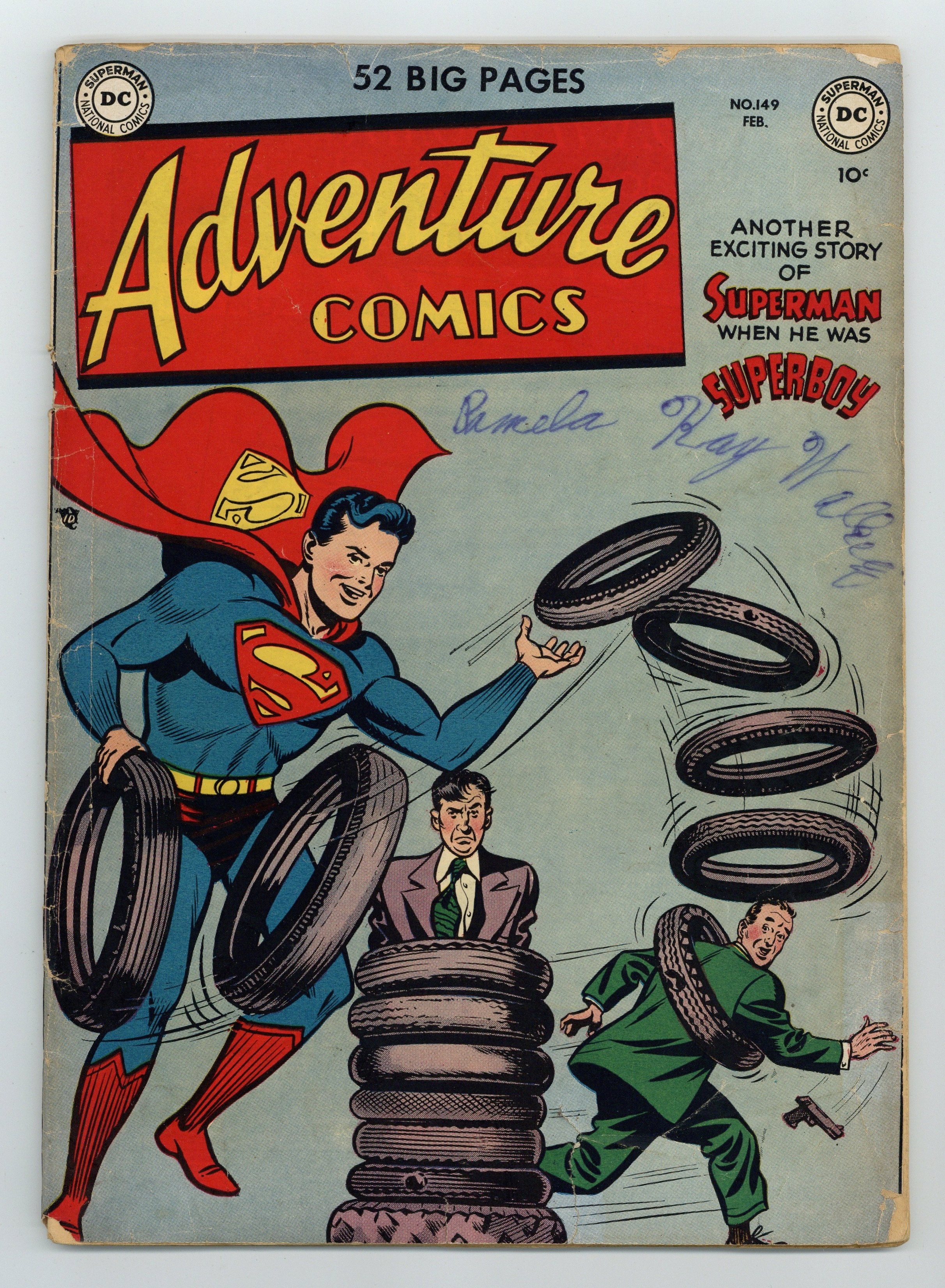 Starts Apr 27 Cover art by Al Plastino. Fake Superboy!, art by John Sikela; first story in which Pa Kent's name is given as Jonathan; also shows him running the Smallville General Store. Undersea Artist! starring Aquaman, script by Joe Samachson, art by John Daly. He Lived What He Wrote--Real Fact, pencils by Dick Sprang; the story of Jack London. The Battle of the Bows! starring Green Arrow, art by George Papp. The Search of the Century! starring Johnny Quick, art by Ralph Mayo. Batman and Robin star in a one-page public service announcement, Batman and Robin Stand Up for Sportsmanship! 52 pages, Full Color. Cover price $0.10.