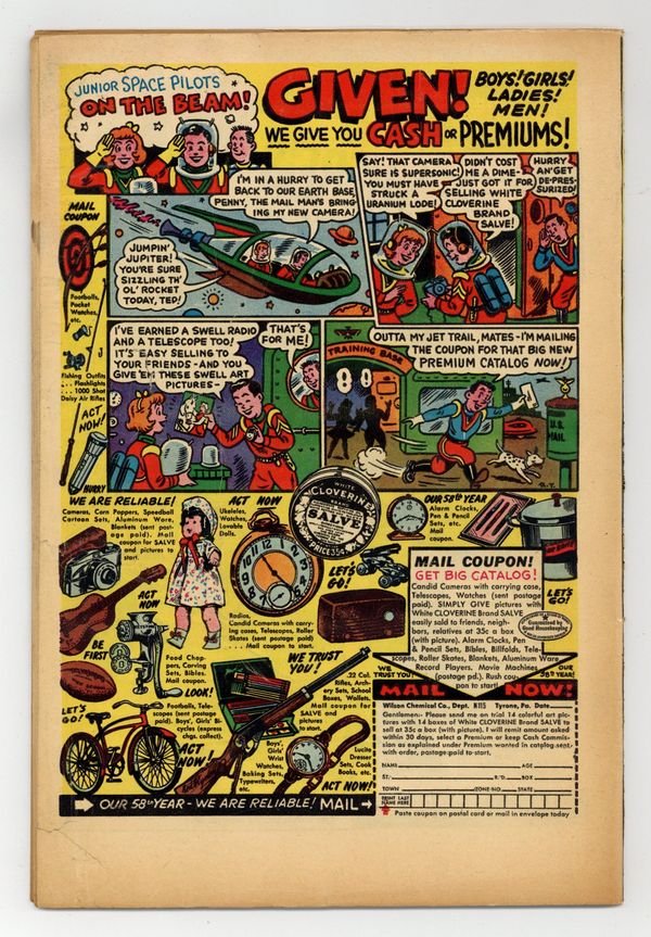 $95.00Cover art by Win Mortimer. The Two Clark Kents starring Superboy, pencils by Curt Swan. The Aqua-Cop of the Sea starring Aquaman, art by Ramona Fradon. How to Spend a Summer Week! public service announcement starring Binky, script by Jack Schiff, art by Win Mortimer. The Impossible Deliveries starring Johnny Quick, art by Ralph Mayo. Varsity Vic humor page by Henry Boltinoff. The King of the Ivory Raiders starring Green Arrow, art by George Papp. 44 pages, Full Color. Cover price $0.10.