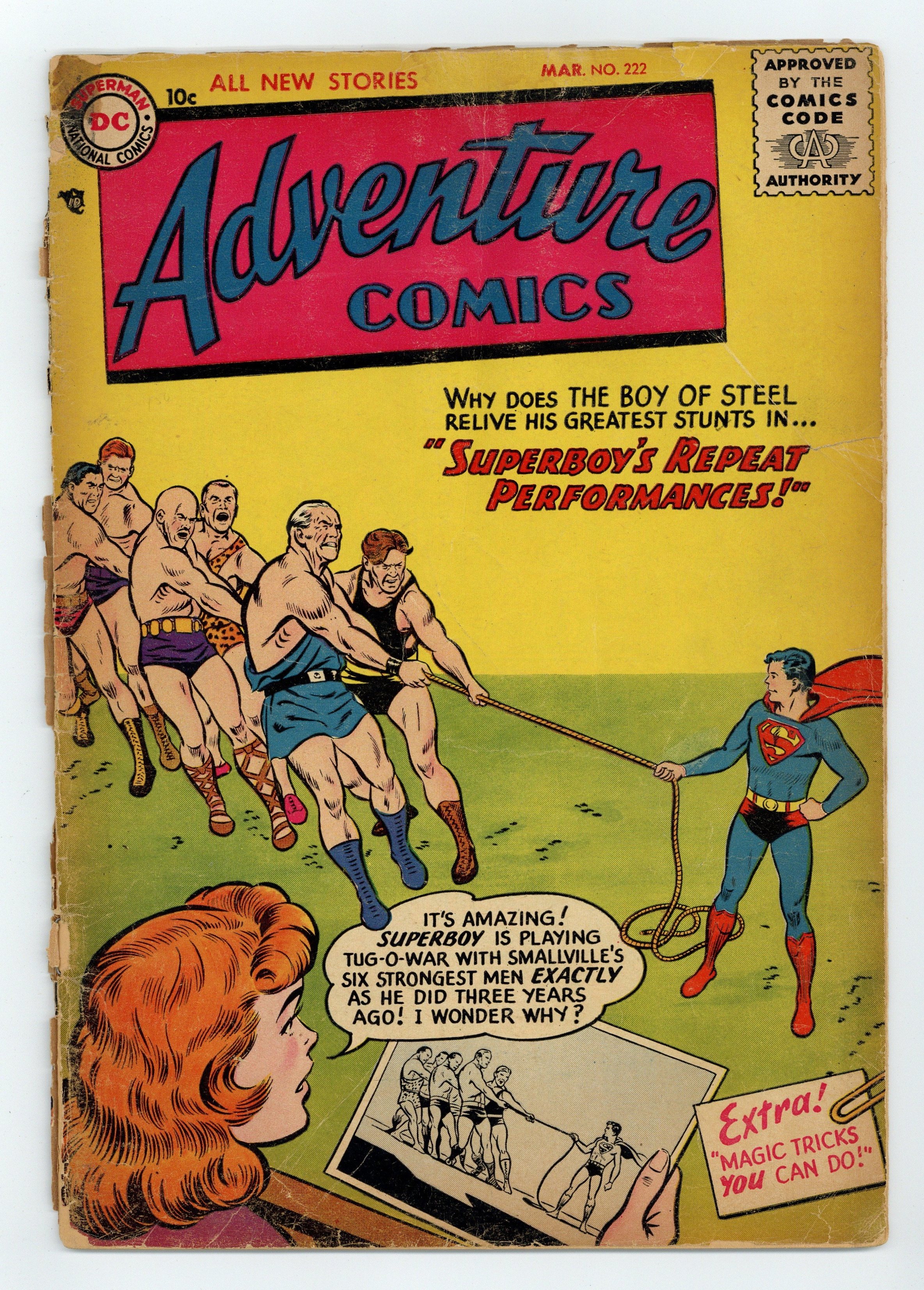 Cover pencils by Curt Swan, inks by Stan Kaye. Superboy's Repeat Performance, script by Otto Binder, art by John Sikela; Superboy is compelled to repeat past super deeds after an encounter with a kryptonite meteor. Little Pete humor page by Henry Boltinoff. A Rival For Aquaman, art by Ramona Fradon; Aquaman meets a mysterious character who can swim at super speed. Varsity Vic humor page by Henry Boltinoff. Magic Tricks You Can Do article. The Cowboy Archers starring Green Arrow, art by George Papp. 36 pages, Full Color. Cover price $0.10.