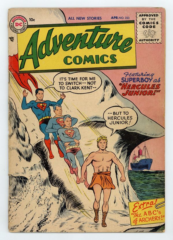 Cover pencils by Curt Swan, inks by Stan Kaye. Hercules, Junior, pencils by Curt Swan, inks by Stan Kaye; Superboy adopts a new secret identity to help a sea captain famous for helping others. The Sunken City of Gold starring Aquaman, script by Jack Miller, art by Ramona Fradon. Varsity Vic humor two-pager by Henry Boltinoff. The ABC's of Archery article. The Decoy Archer, art by George Papp; Green Arrow recruits a man of questionable character to be his understudy. 36 pages, Full Color. Cover price $0.10.