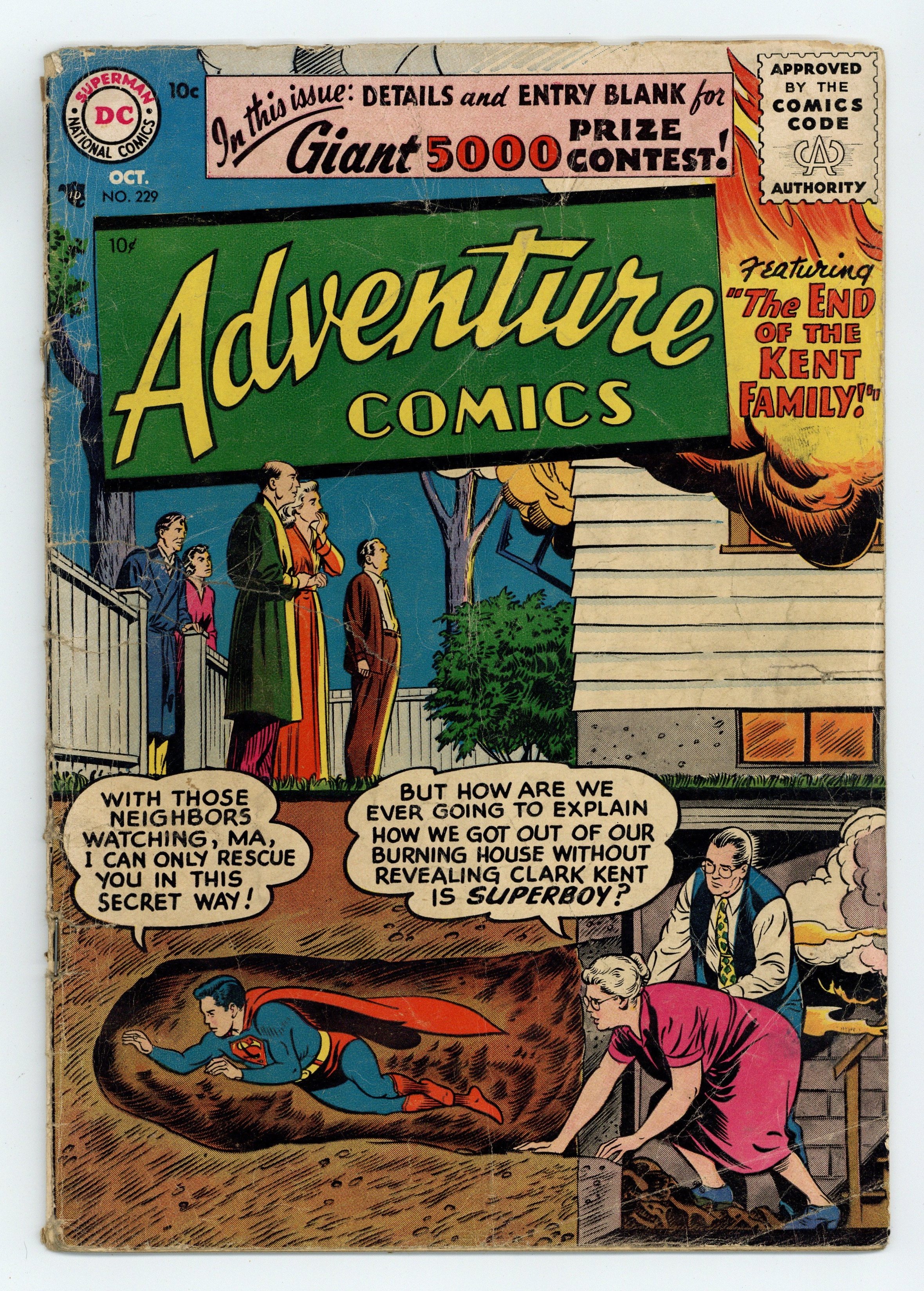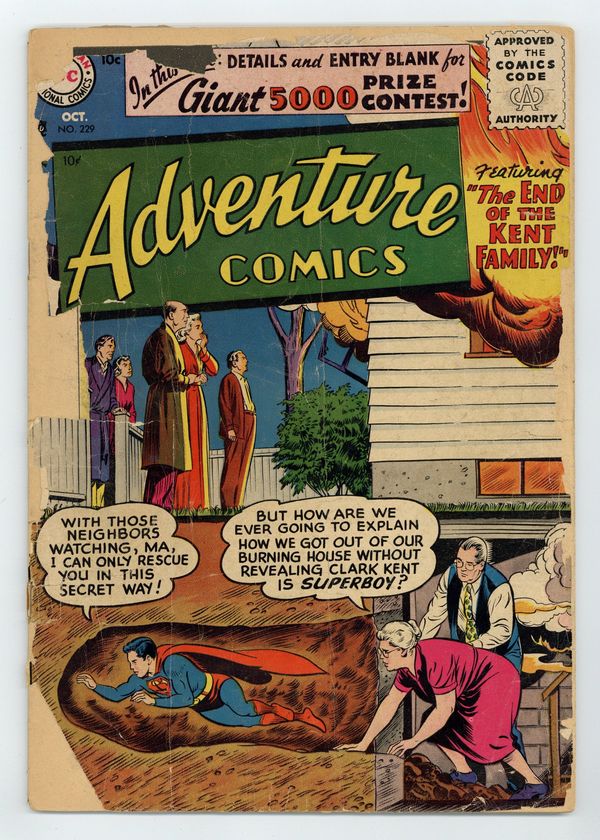 Cover pencils by Curt Swan, inks by Stan Kaye. The End of the Kent Family starring Superboy, script by Otto Binder, art by John Sikela; The Kents have to start a new life in another town after the house is destroyed by a meteor. Aquaman's Undersea Partner, art by Ramona Fradon; Aquaman picks one undersea creature to be his special assistant. The Wildcat Archers starring Green Arrow, art by George Papp. 36 pages, Full Color. Cover price $0.10.