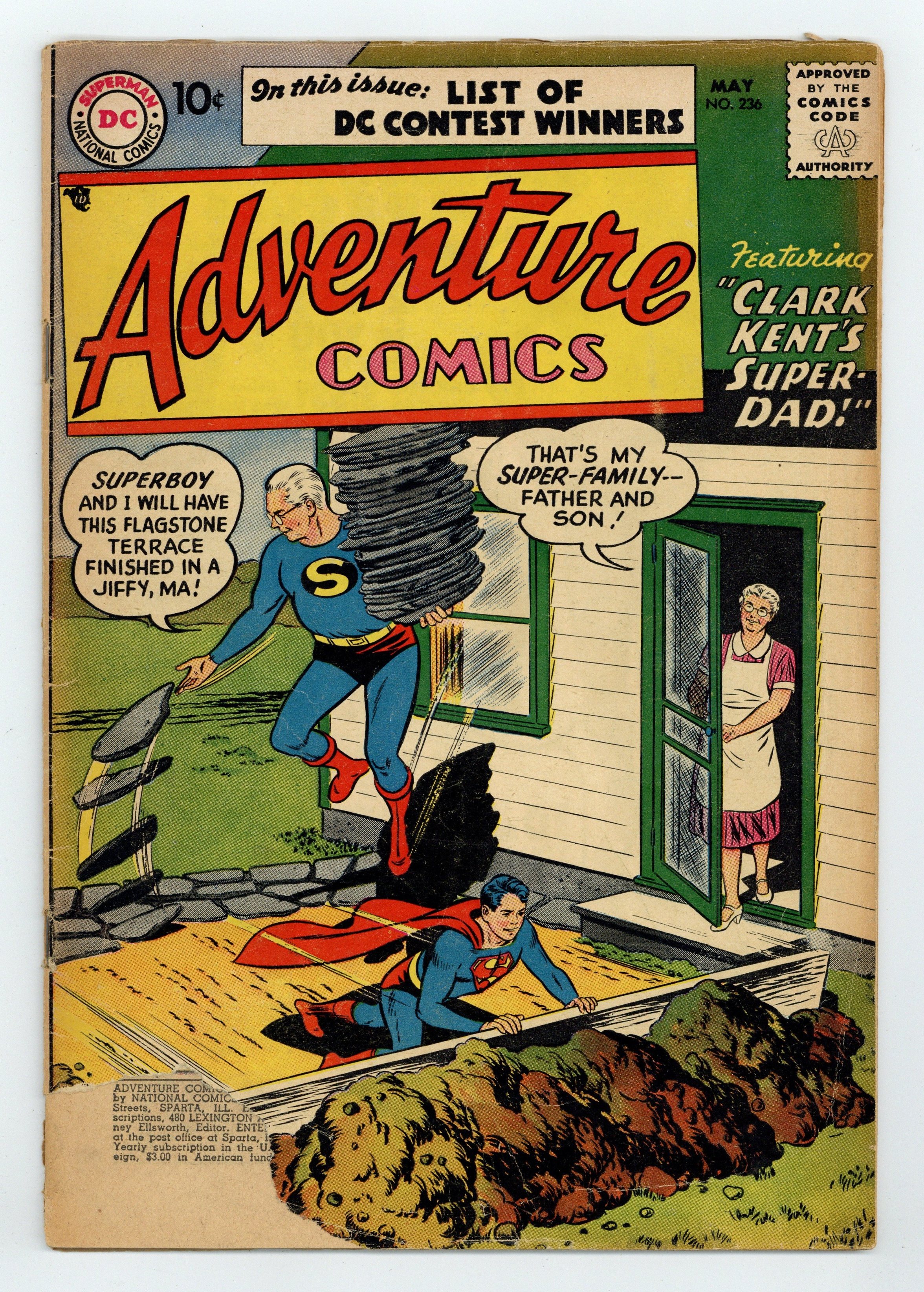 Cover pencils by Curt Swan, inks by Stan Kaye. Clark Kent's Super-Dad, script by Jerry Coleman, art by John Sikela; Pa Kent gains super-powers and goes into action as Strongman. Hy Wire humor page by Henry Boltinoff. The Iceberg of Doom starring Aquaman, script by Otto Binder, art by Ramona Fradon. 36 pages, Full Color. Cover price $0.10.