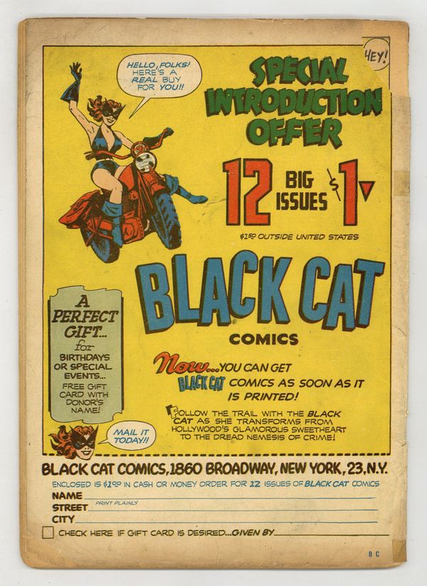 Edited by Leon Harvey. Cover by Lee Elias. Stories by Lee Elias, Arturo Cazeneuve, George Roussos, Joe Kubert, and Art Helfant. The Black Cat in "Who is the Black Cat?" and "Banker's Holiday" (art on both by Lee Elias). Also Block Buster Barton and His Gang in "The Rampaging Reporters," Johnny Nebisco in "Bang! Bang! Went the Trolley!" and "Dance Macabre: Gabriel Blows His Horn!" (art by Joe Kubert). 52 pages, full color. Cover price $0.10.