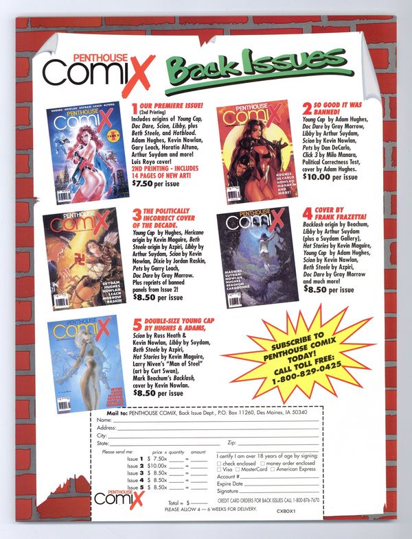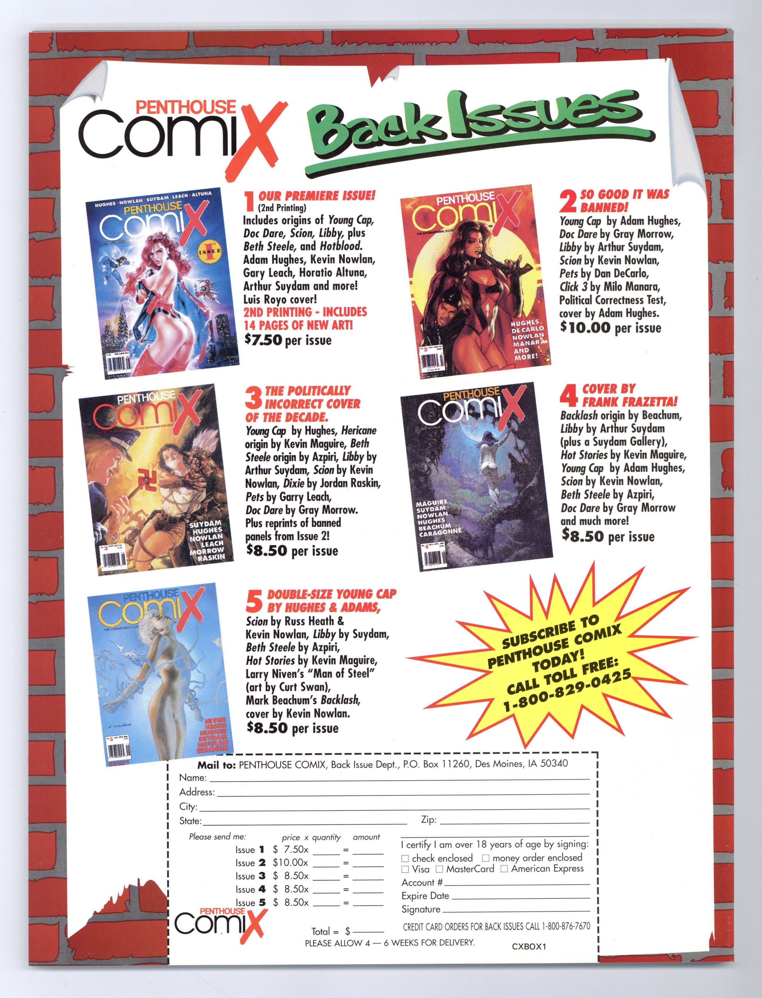 Published 1995 by Penthouse International, LTD..$15.00Second Printing Special Edition. 14 pages of new material. Young Captain Adventure, Part 1; Hotblooded; Scion, Part 1; The Hunter; Libby in the Lost World; Bethlehem Steele, Part 1; Pirate Hearts; Doctor Dare and the Spear of Destiny, Part 1; The Right Man for the Job. Written by George Caragonne, Ray Weisfeld, Horatio Altuna. Art by Adam Hughes, Kevin Nowlan, Arthur Suydam, Garry Leach, Mike Harris, Jordan Raskin, and Horatio Altuna. 96 pages, full color. Mature Readers. Cover price $4.95.