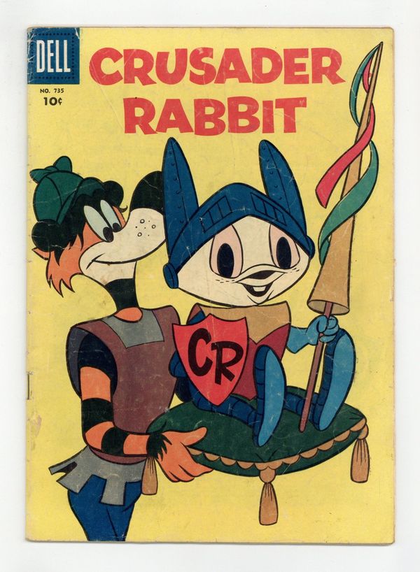 Version with ad on back cover. Indicia title is "CRUSADER RABBIT No. 735." Based on the 1949-57 animated TV series "Crusader Rabbit." Cover art by Dan Gormley. Crusader Rabbit and the Schmohawk Indians, script by Nancy Hoag, art by Dan Gormley; The Schmohawk Indians kidnap Rags; Crusader Rabbit rescues him and persuades the Schmohawks that they can become famous by going on the warpath. Crusader Rabbit and the Lechrechaun's Gold, script by Nancy Hoag, art by Dan Gormley; Crusader Rabbit and Rags are made honorary leprechauns; All the leprechauns have to hide the pots of gold that follow them. Promo for Smokey Stover Four Color #730. 36 pages, full color. Cover price $0.10.