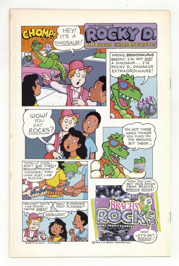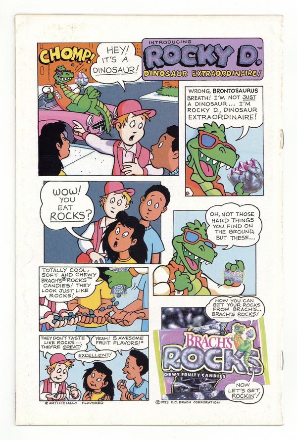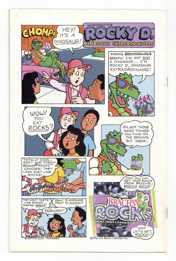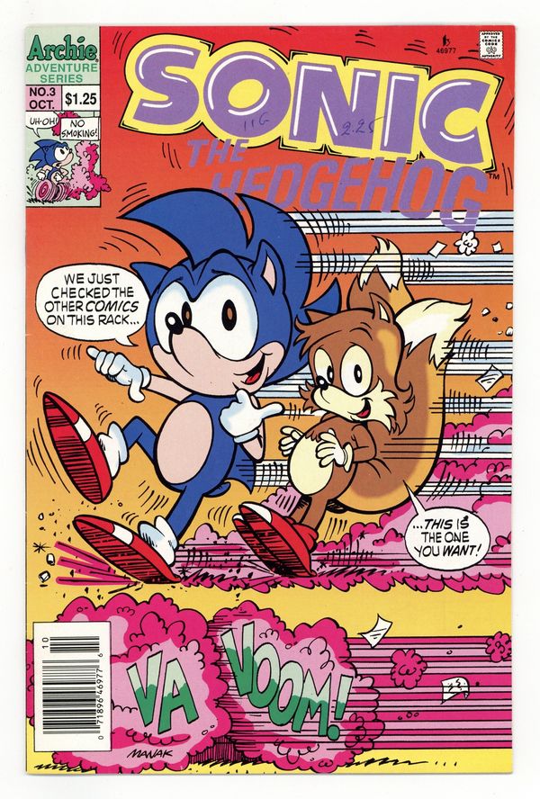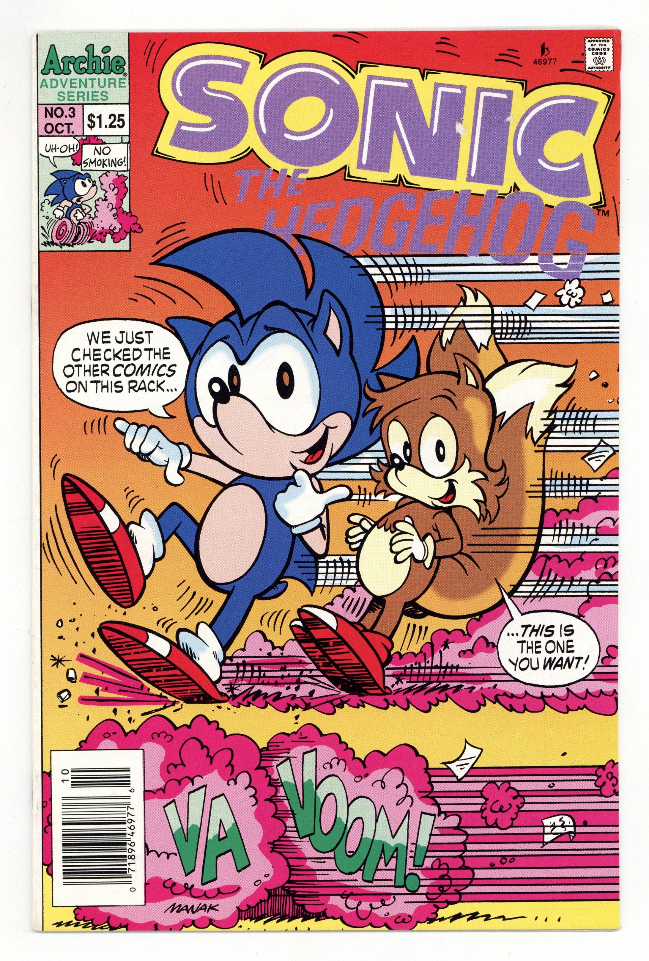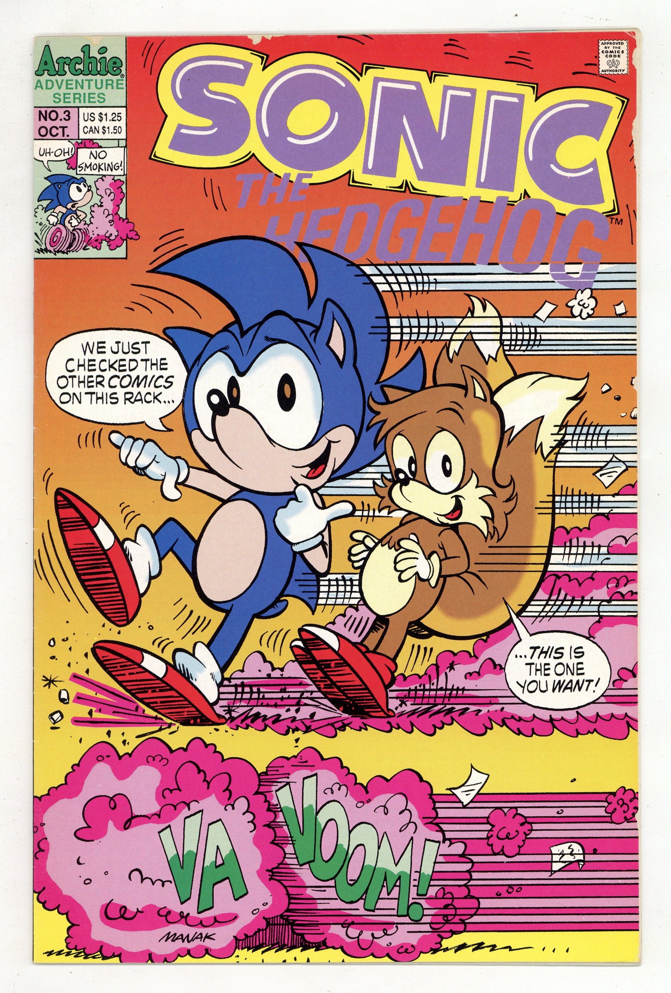 Cover pencils by Dave Manak, inks by Jon D'Agostino. The Bomb Bugs Me! Tails Fairy Tales. Double Speak! Paper Trail! Rabbit Deployment! Rabbit Deployment! Scripts by Michael Gallagher, pencils by Dave Manak, inks by Jon D'Agostino. Archie and the Gang Tell Us About Recycling Plastic Containers public service announcement starring Archie, Betty, and Veronica. Inspired by the Sega Genesis videogame. 36 pgs. $1.25. Cover price $1.50.