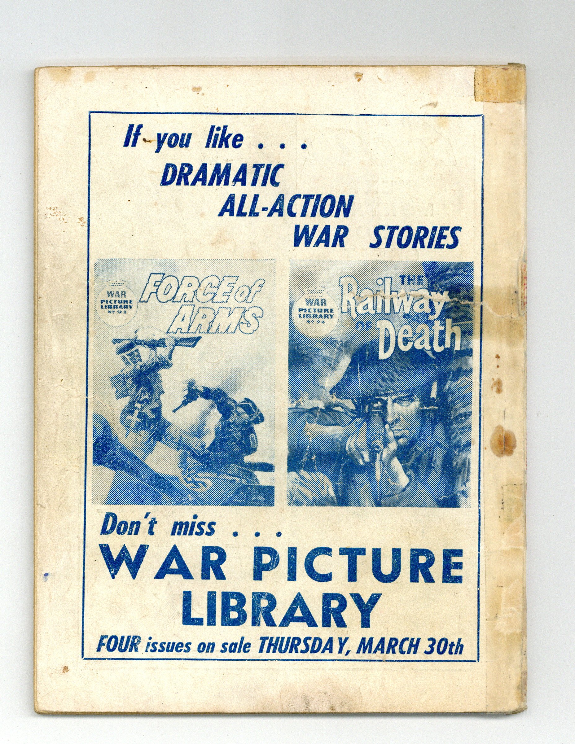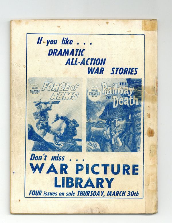 Published 1961 (est.) by IPC/Fleetway.$3.00- Front cover detached 20%. Back cover detached 20%. Water damage: Moderate. Staple rust: Extensive.