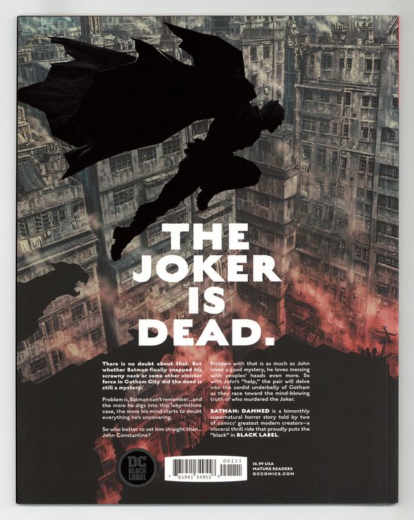 Written by Brian Azzarello. Art and Cover by Lee Bermejo. DC BLACK LABEL, the highly anticipated new imprint from DC Comics, starts here! The Joker is dead. There is no doubt about that. But whether Batman finally snapped his scrawny neck or some other sinister force in Gotham City did the deed is still a mystery. Problem is, Batman can't remember… and the more he digs into this labyrinthine case, the more his mind starts to doubt everything he's uncovering. So who better to set him straight than… John Constantine? Problem with that is as much as John loves a good mystery, he loves messing with people's heads even more. So with John's 'help,' the pair will delve into the sordid underbelly of Gotham as they race toward the mind-blowing truth of who murdered The Joker. BATMAN: DAMNED is a bimonthly super-natural horror story told by two of comics' greatest modern creators-a visceral thrill-ride that proudly puts the 'black' in BLACK LABEL. 48 pages, full color. Mature Readers Cover price $6.99.