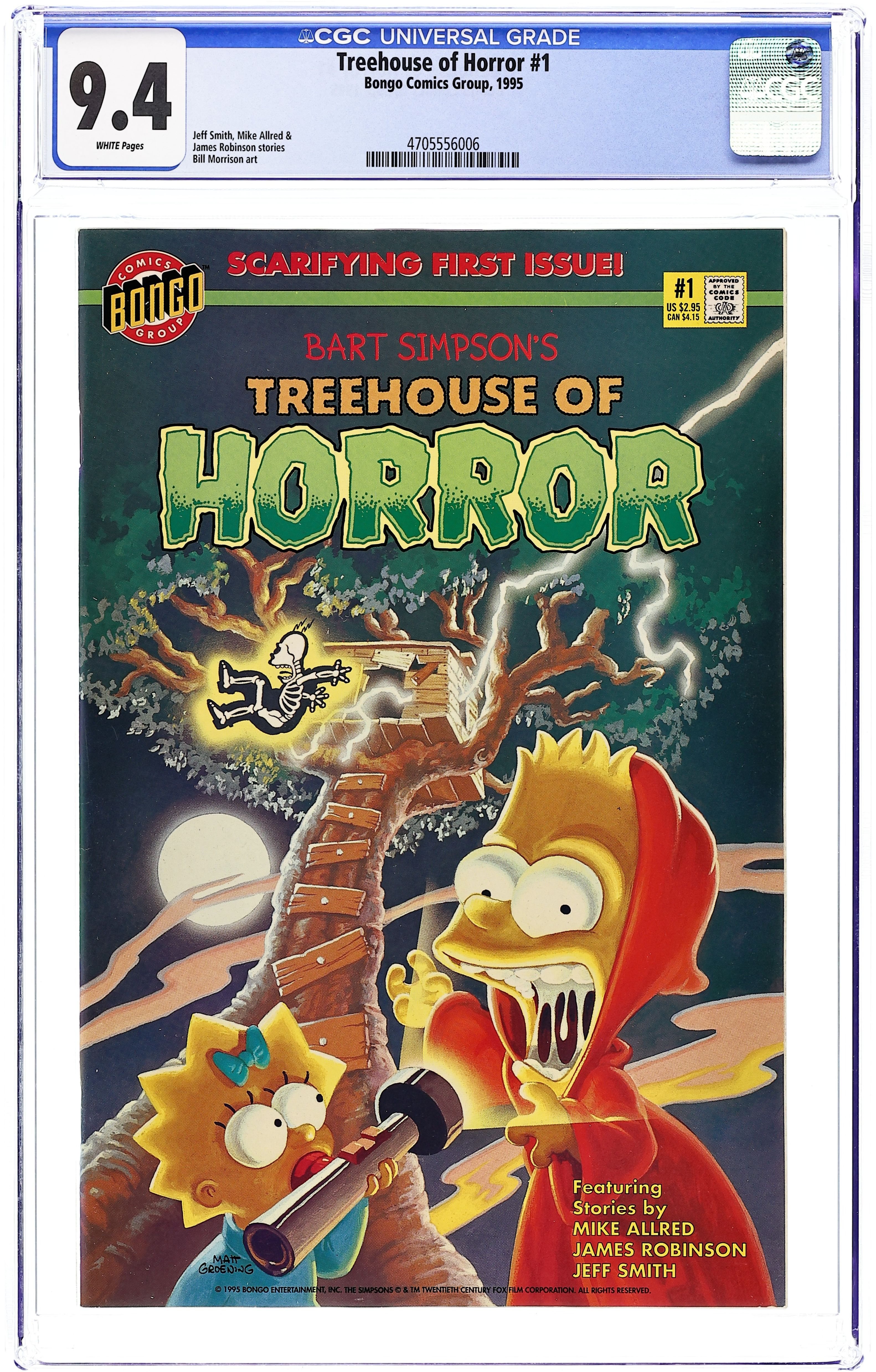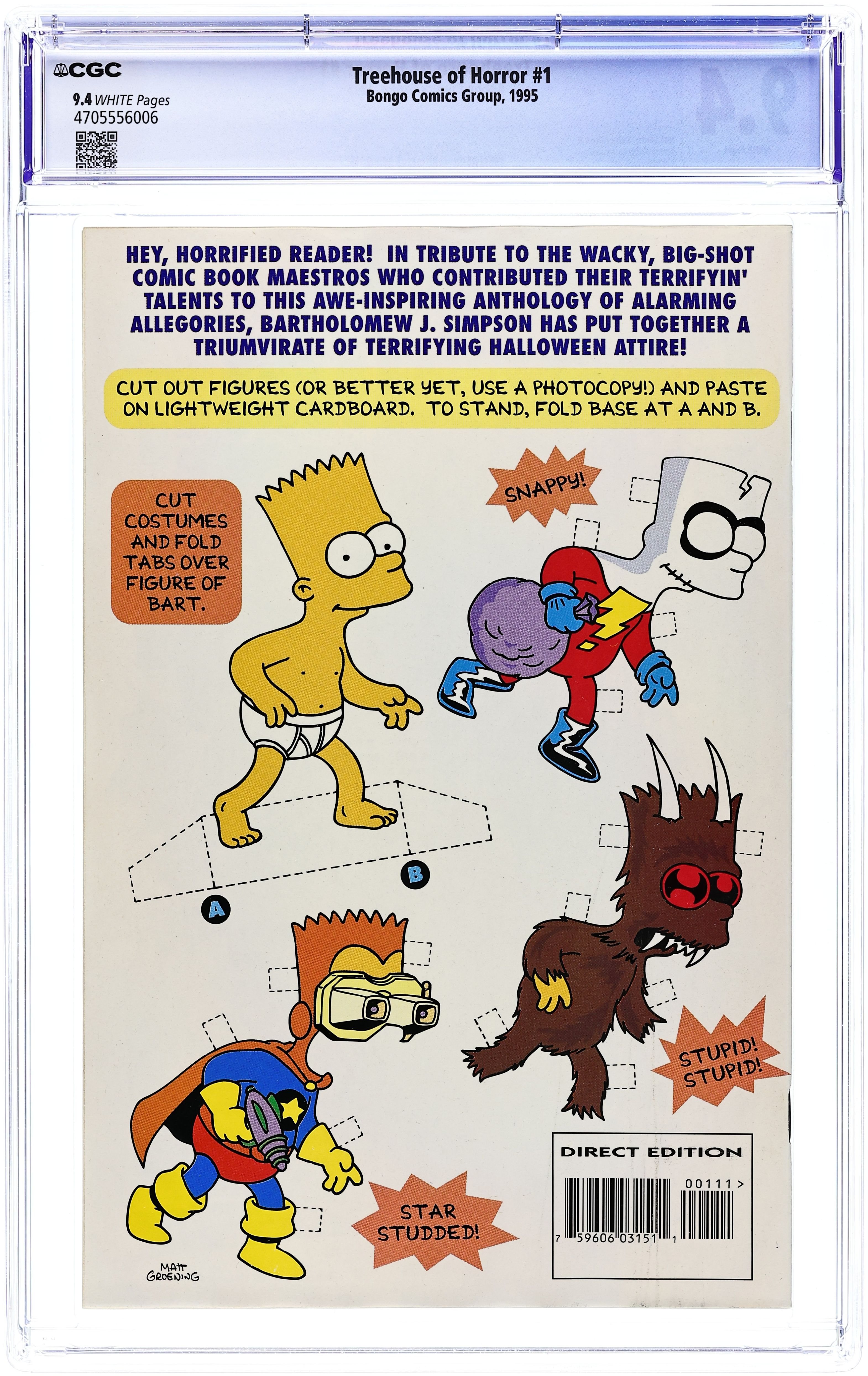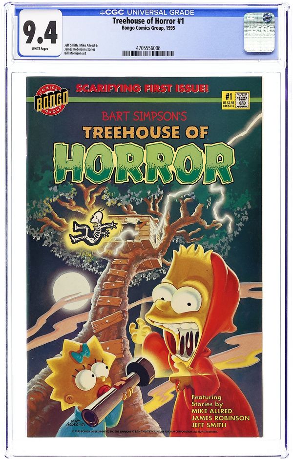 Written by Mike Allred. Art by Luis Escobar, Bill Morrison, and Mike Allred. Cover credited to Matt Groening. Parody of Little Shop of Horrors. Written by Jeff Smith, Stephanie Gladden, and Bill Morrison. Parody of Call Me Ishmael. Written by James Robinson. Art by Chris Roman and Bill Morrison. Parody of Cat People. Bart Simpson as a paper doll activity page. Based on The Simpsons TV show. 52 pages, full color. $2.95. Cover price $2.95.
