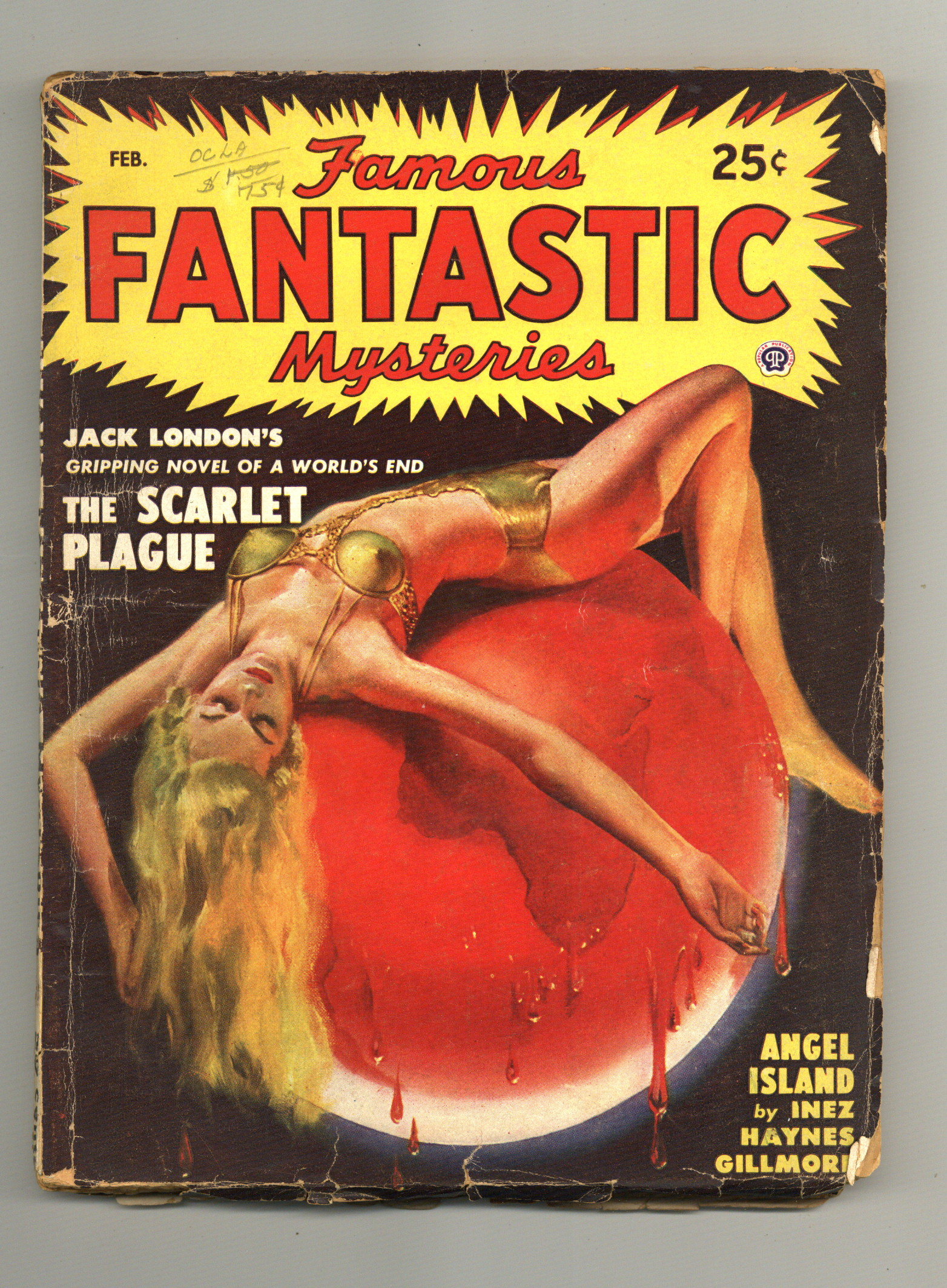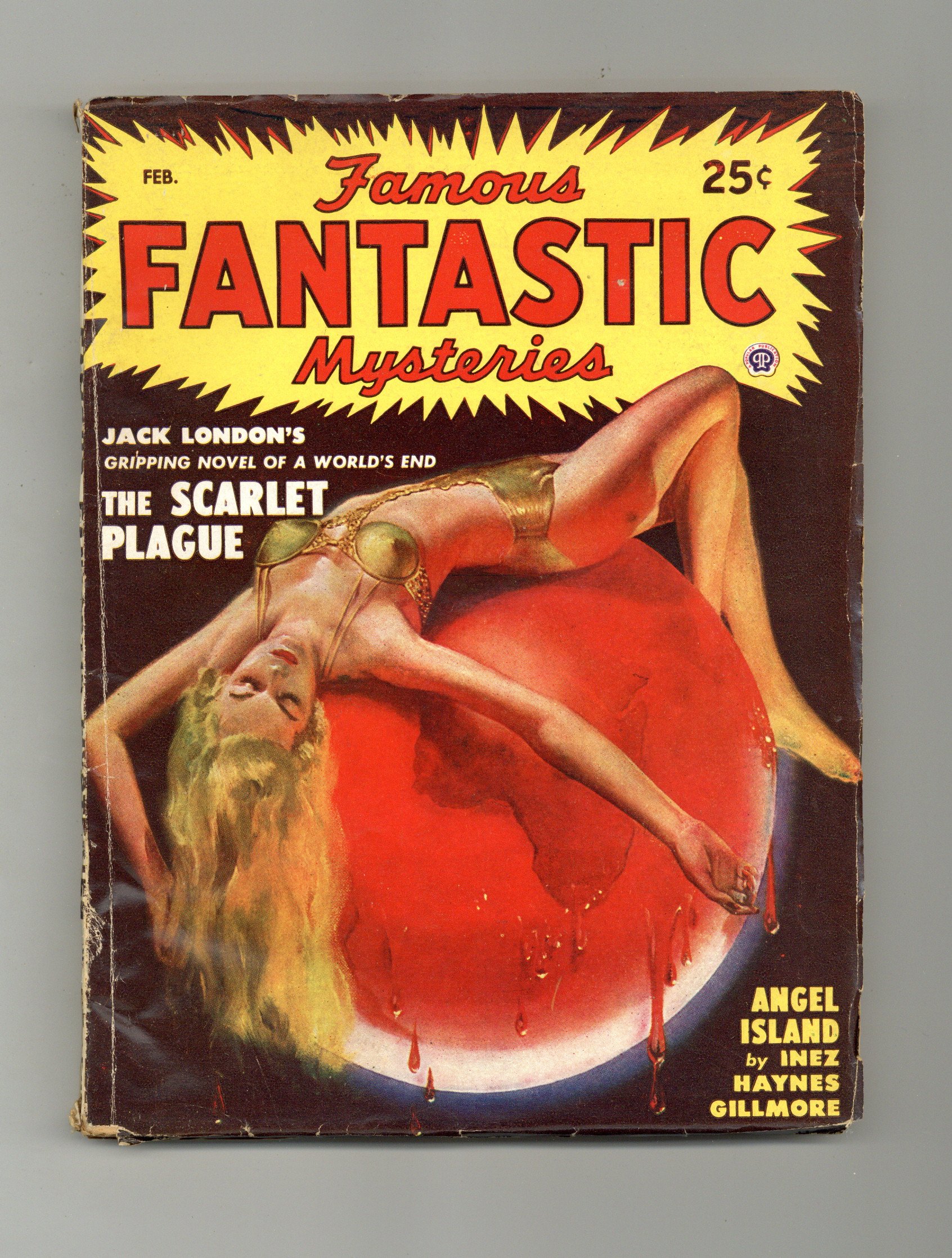 Volume 10, Issue 3 - February, 1949. Cover by Lawrence Stevens. Stories by Inez Haynes Gillmore and Jack London. Illustrations by Lawrence Stevens and Leydenfrost. Book-length novel: "Angel Island" by Inez Haynes Gillmore - Five desperate, earthbound men...an isle where Love and Death were neighbors...a day when wings fought free of fetters to make a strange new world. Novelette: "The Scarlet Plague" by Jack London - Across a sick world it had crept, leaving man and his works destroyed. Now, in the twilight of history, only one remembered -- a blurred and faded picture of the death of our times. Also: The Readers' Viewpoint; In the Next Issue; Masters of Fantasy by Neil Austin - M.P. Shiel, High Priest of Phantasy; and The Lawrence Portfolio. 7-in. x 9 1/2-in., 130 newsprint pages, B&W. Published by Popular Publications Cover price $0.25.