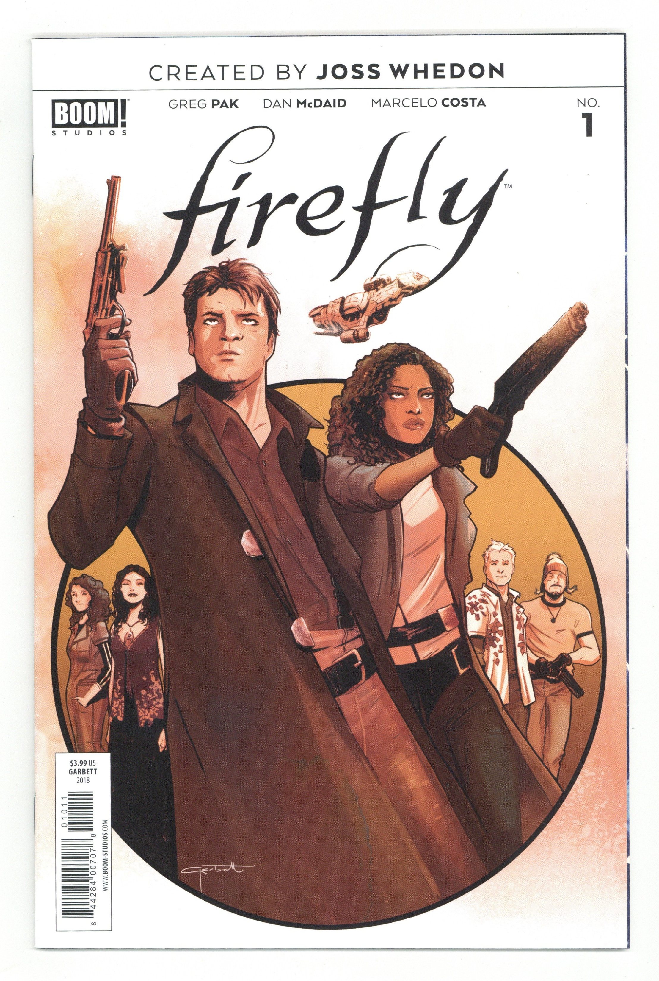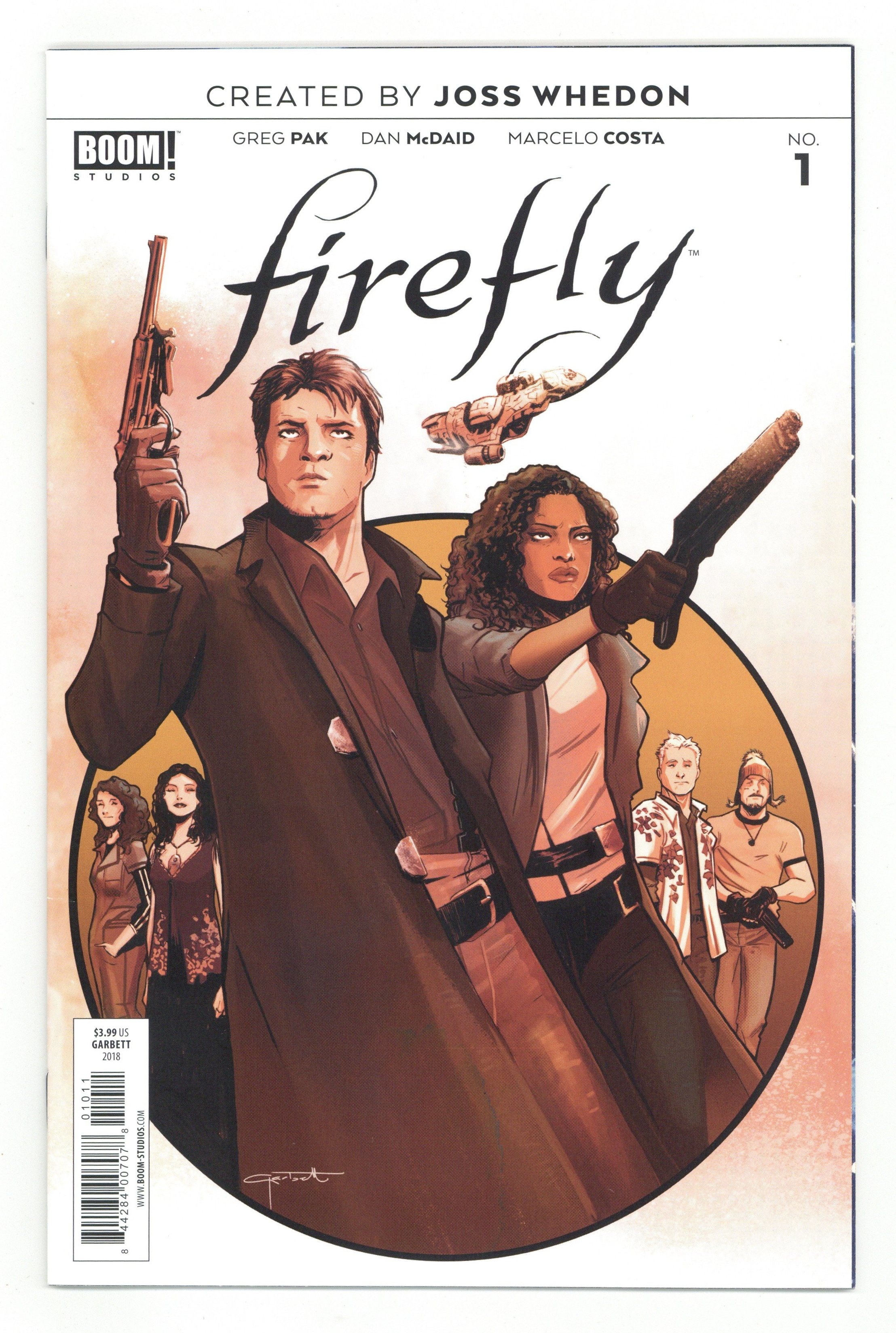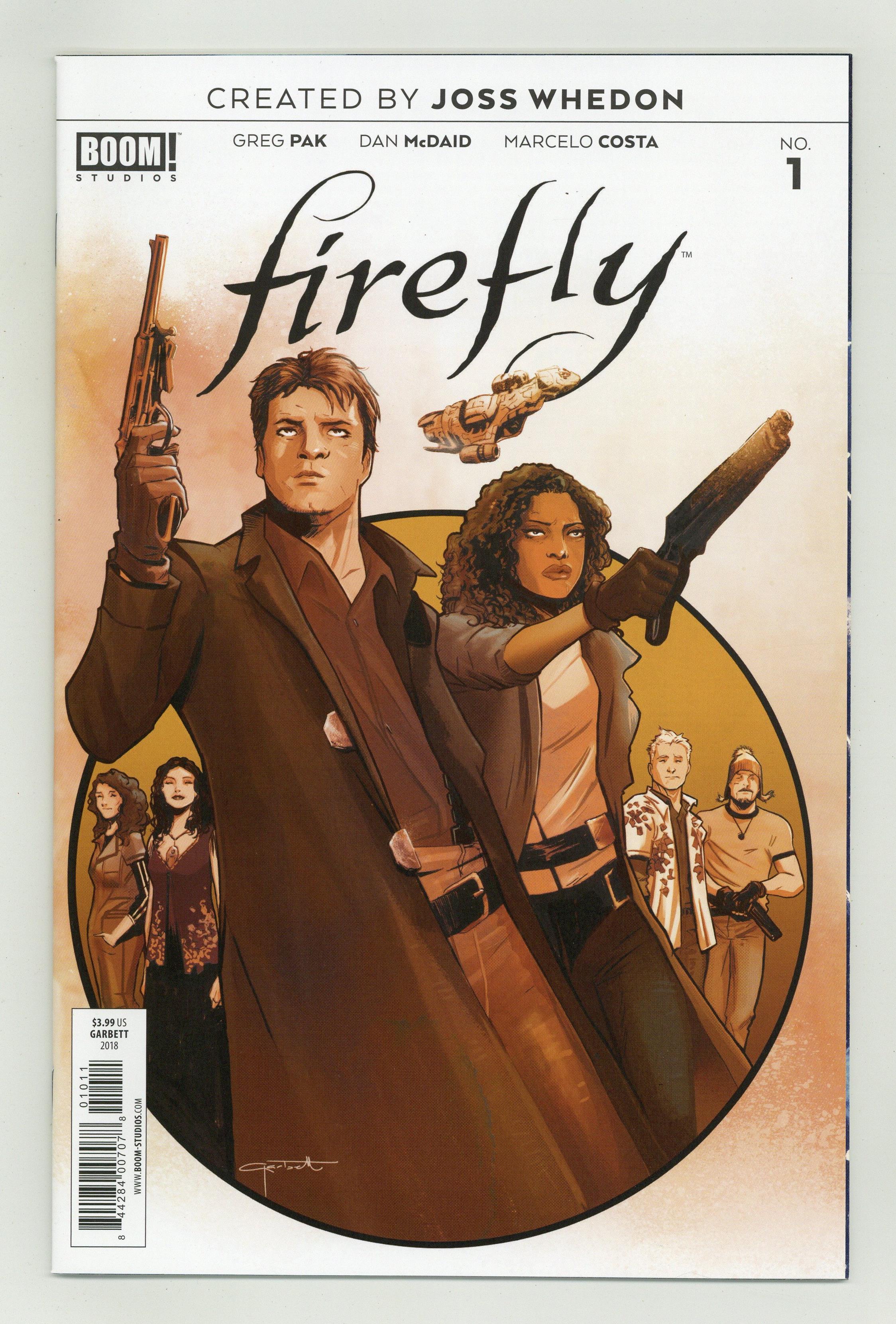 Published Nov 2018 by Boom Studios.$4.80Written by Greg Pak. Art by Dan McDaid. Cover by Lee Garbett. BOOM! Studios, along with visionary writer and director Joss Whedon (Buffy the Vampire Slayer, The Avengers), presents an all-new era of the pop culture phenomenon Firefly , as one of the most demanded stories in the franchise's history is revealed for the first time! Captain Malcolm 'Mal' Reynolds, a defeated soldier who opposed the unification of the planets by the totalitarian governed Alliance, will undertake any job-legal or not-to stay afloat and keep his crew fed. Find out now how his story began as BOOM! Studios delves into Mal's past, how he met his first mate Zoe and the real truth about the War of Unification.the intergalactic civil war that divided friend and family alike. Focusing on family, loyalty, identity, and the price of redemption, writer Greg Pak (Mech Cadet Yu, Totally Awesome Hulk) and artist Dan McDaid (Judge Dredd: Mega City Zero) take you back to the battleground where Mal's journey began. 32 pages, full color. Cover price $3.99.
