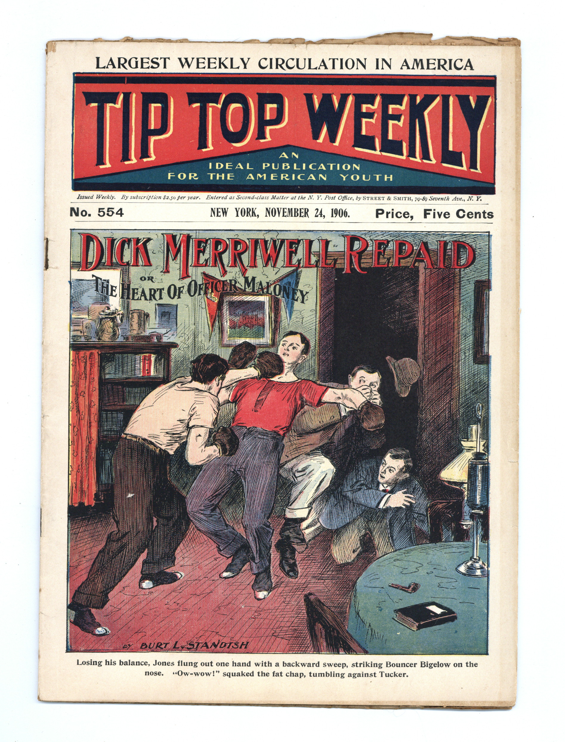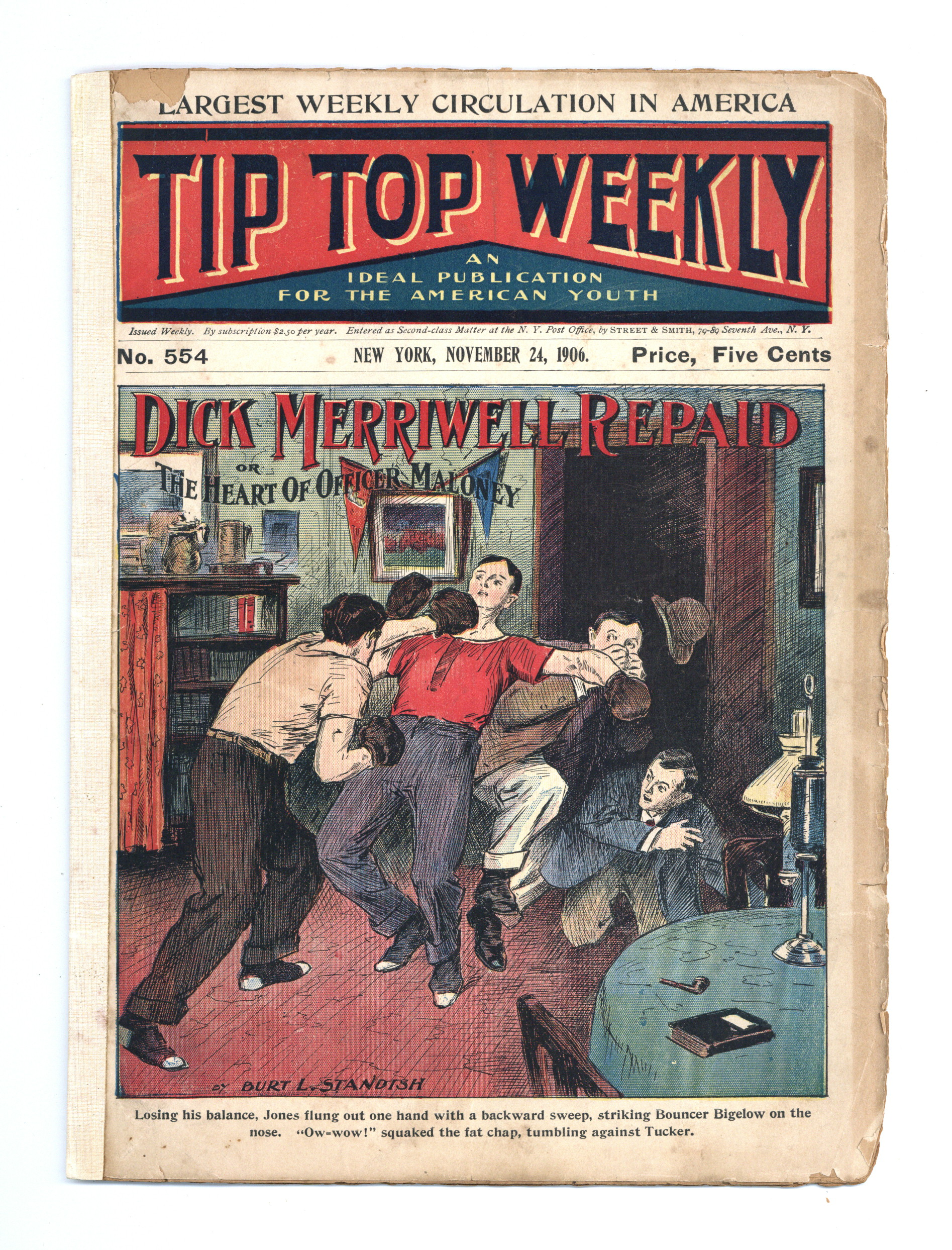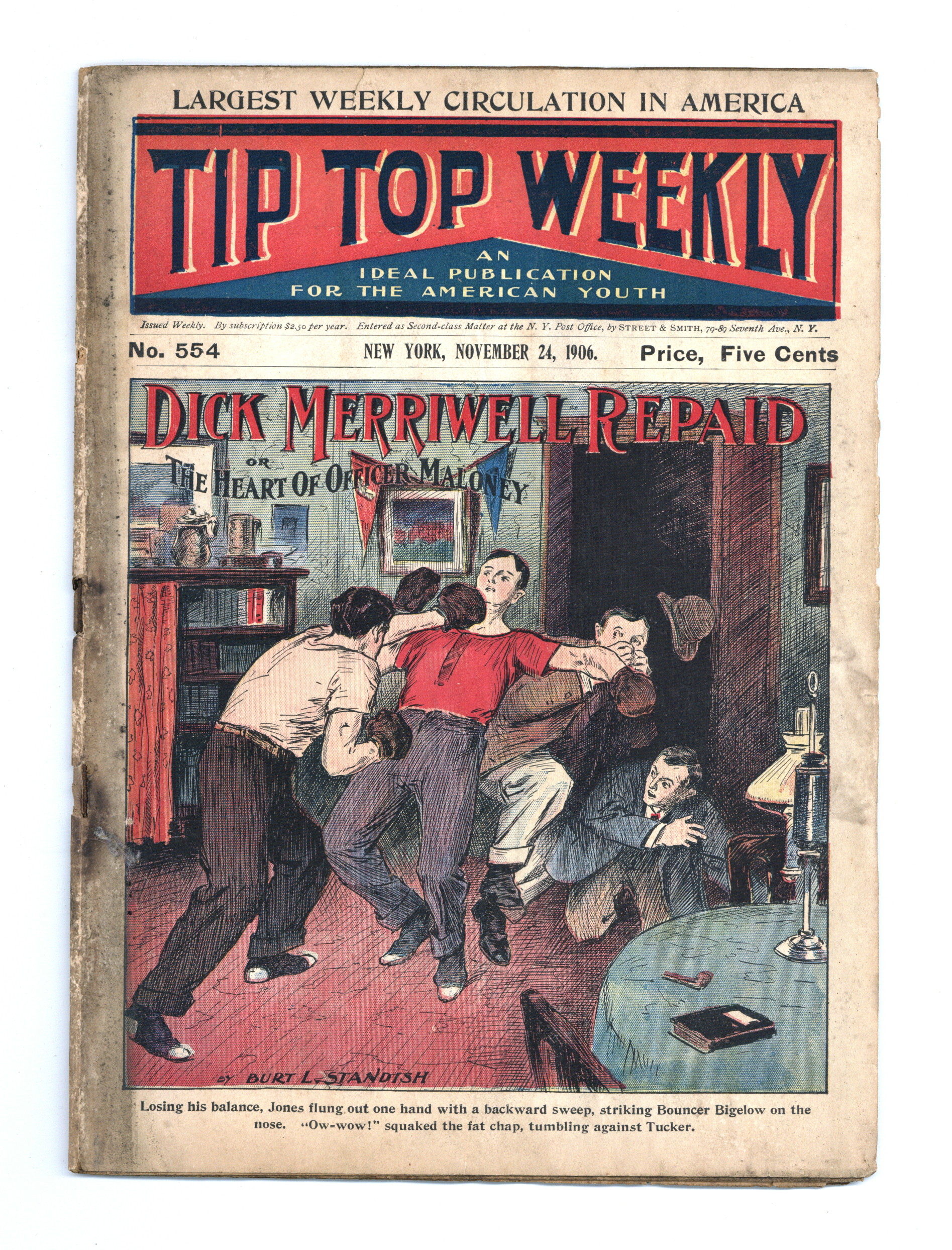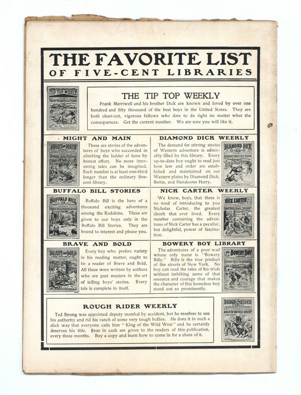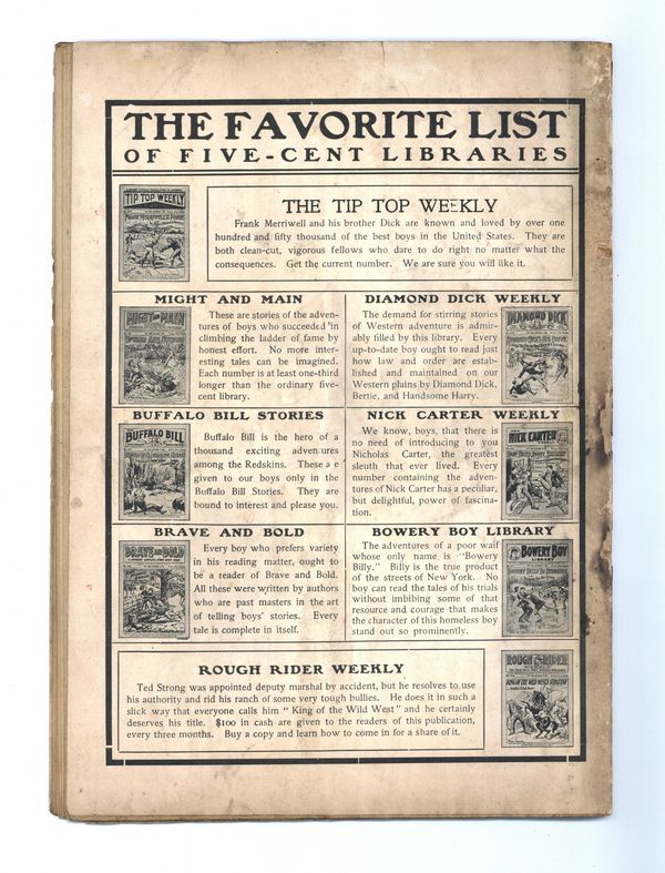 Published Nov 1906 by Street & Smith.$5.00- Spine split 30%. Cover Detached. Water damage: Extensive. Staple rust: Extensive.