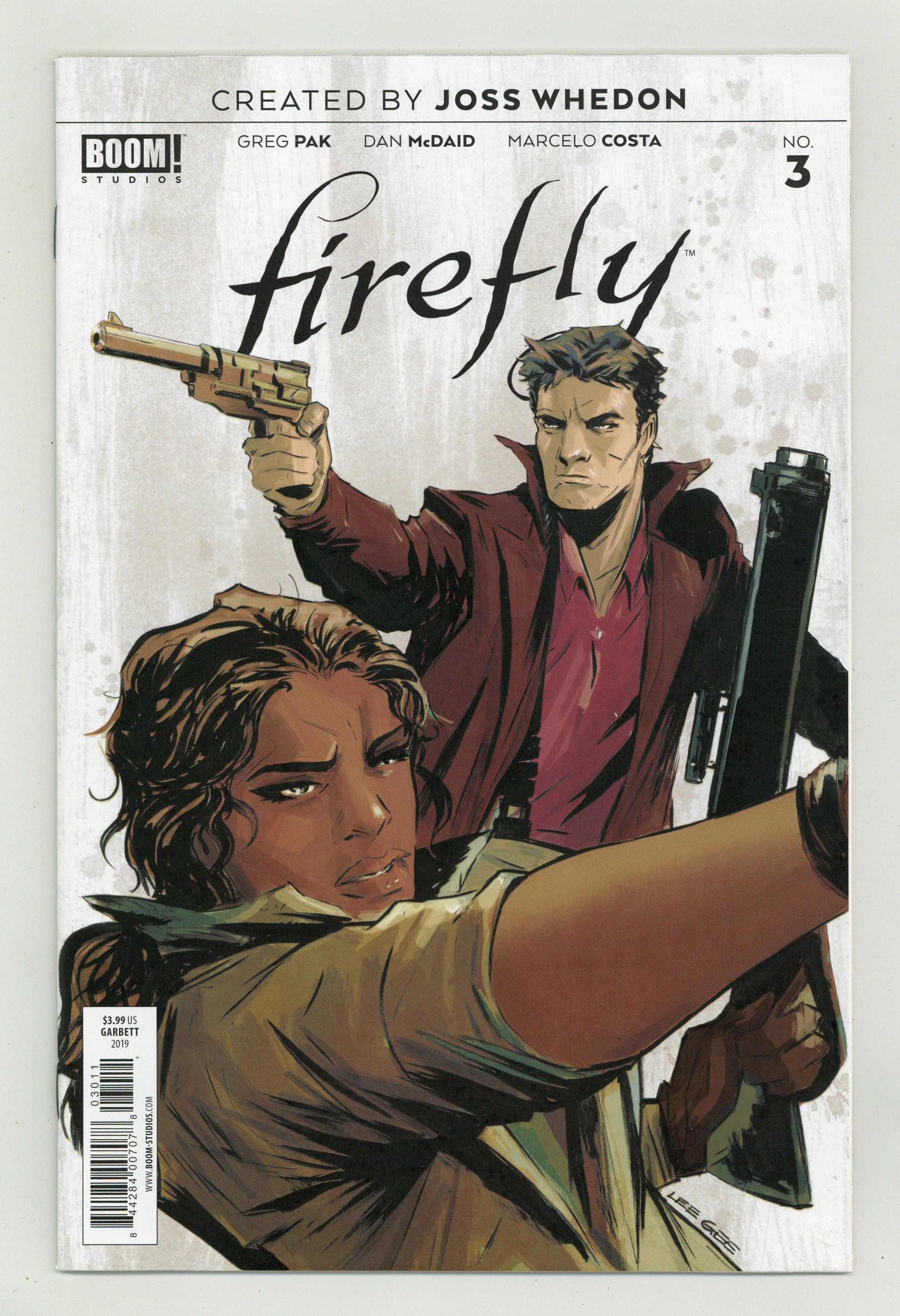 Published Jan 2019 by Boom Studios.$5.00Written by Greg Pak. Art by Dan McDaid. Cover by Lee Garbett. With the Unificators closing in, Mal and Zoe must take some big risks to try to throw the enemy off their scent, as the crew of the Serenity start to grapple with the fact that their captain and first mate might not be who they say they are. 32 pages, full color. Cover price $3.99.