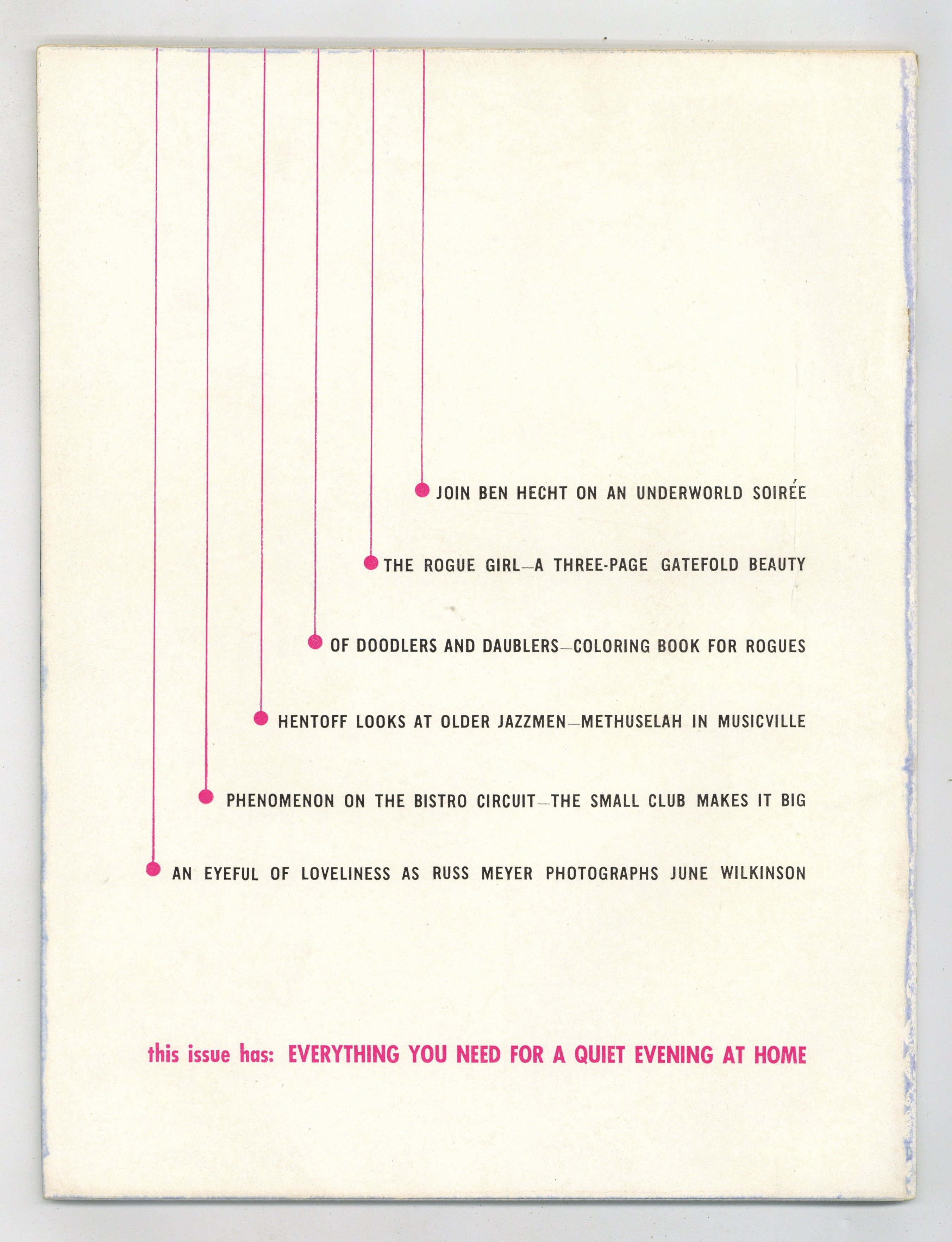 Volume 5, Issue 4 - June, 1960. Vintage men's interest magazine that features articles, exposes, humorous stories and a fair amount of nude pin-up photographs. This issue features articles by Lenny Bruce, Alfred Bester, Irwin Spector, and humor satire "Coloring Book for Rogues" by Harlan Ellison with illustrations by Jerry Warshaw, and short fiction stories "The Golden People" by Theodore Cogswell, and "A Matter of a Minotaur" by Robert S. Malcolm. 8" x 10.5", 80 pages, B&W/Color. -MATURE READERS- Cover price $0.50.