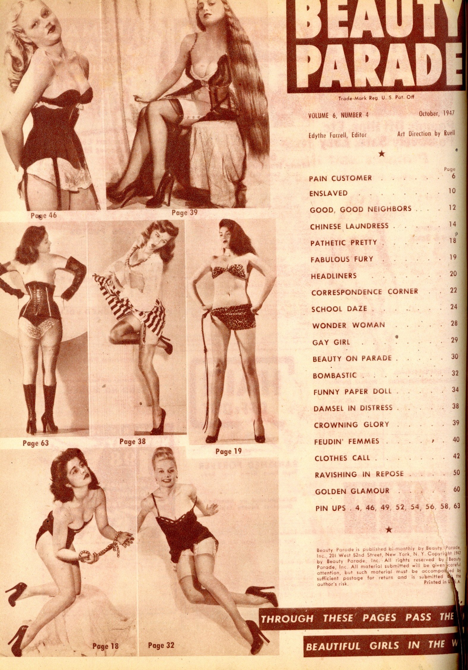 Published Oct 1947 by Beauty Parade Inc..$20.00- Water damage: Moderate. Staple rust: Slight.
