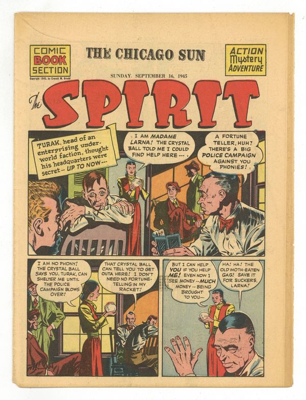 Spirit Weekly Newspaper Comic Insert. 7-1/2 x 10 inches, 16 pages, full color, all newsprint with no slick cover. Wellman/Woolfolk scripts, Fine art with unknown staff assists.