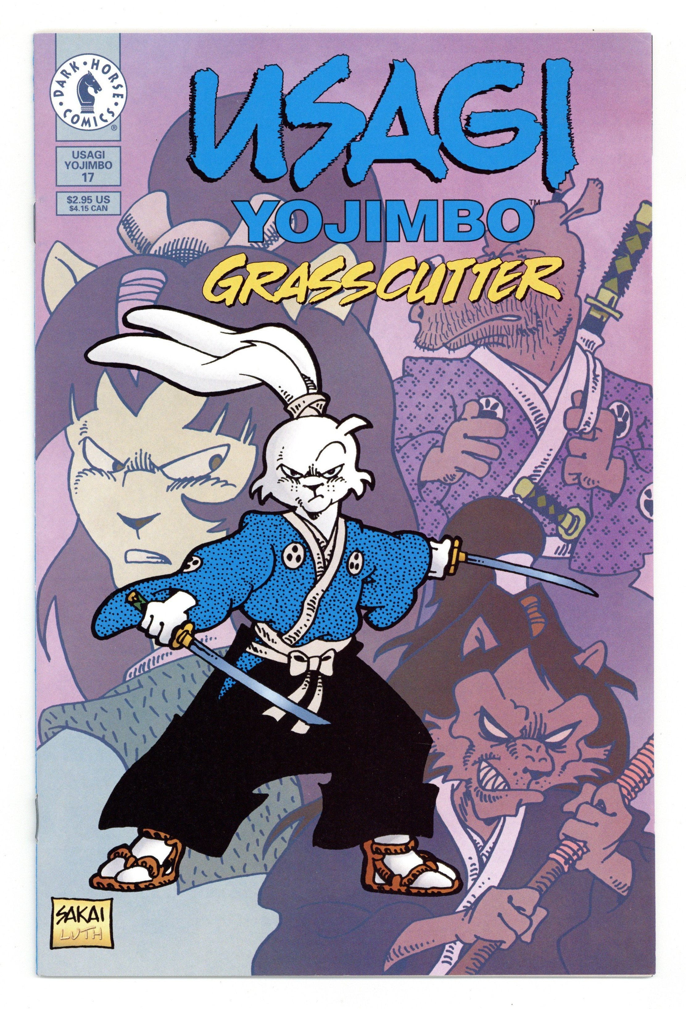 Published Jan 1998 by Dark Horse.$16.00Grasscutter: Part 5 of 10 - Story and art by Stan Sakai. Inazuma is tormented by dreams as she lies helpless and in the hands of Jei, the demonic spearman. Usagi finally gets possession of the sword of the gods but is unaware of its importance. Meanwhile, warriors of the Imperial faction are right behind him. The Conspiracy of Eight plan the assassination of Lord Noriyuki as he travels to Edo for the installation of the new shogun. 32 pages, B&W. Cover price $2.95.