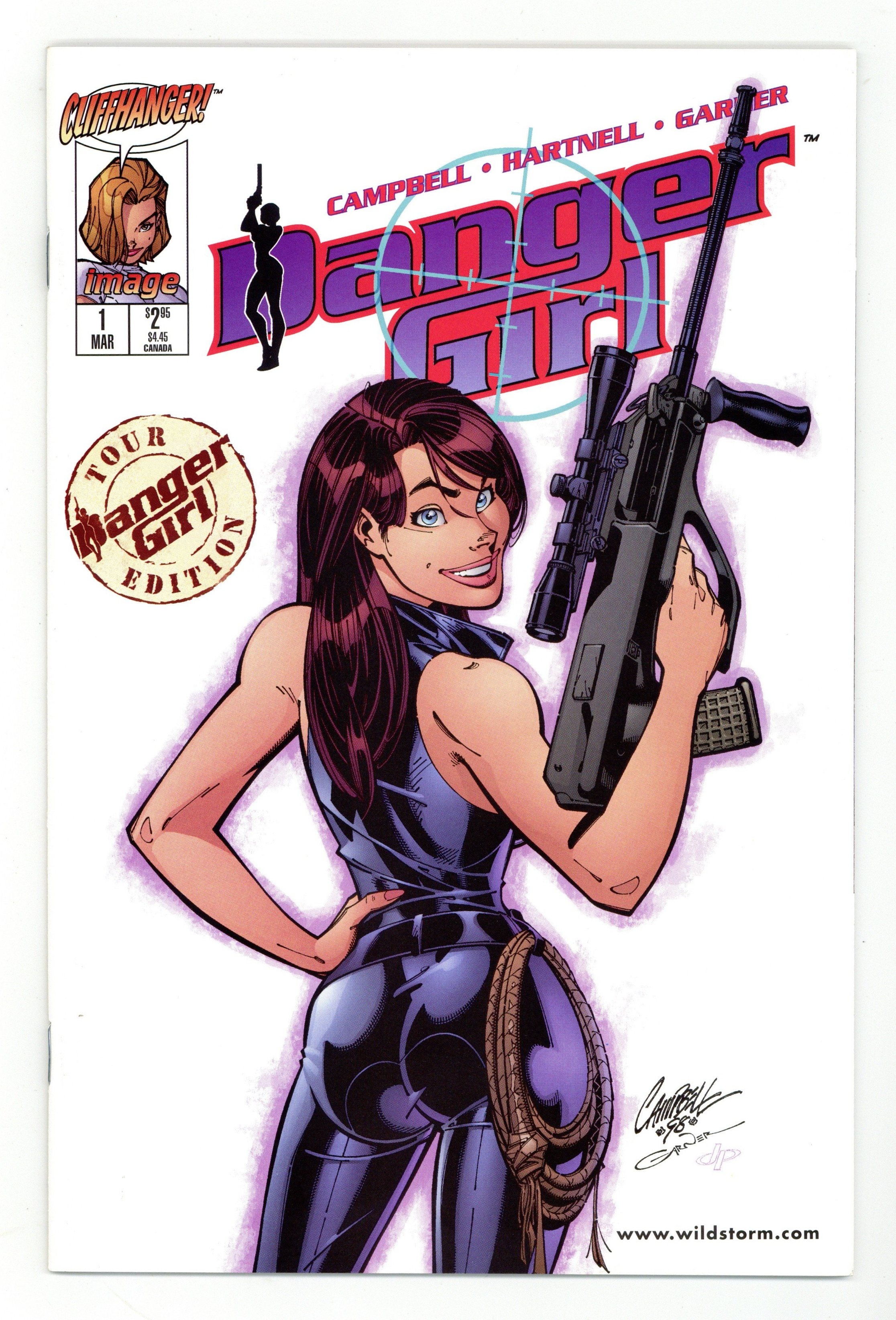 This special Tour Edition was limited to 500 copies. Cover pencils by J. Scott Campbell, inks by Alex Garner. "Dangerously Yours," script by J. Scott Campbell (plot) and Andy Hartnell (script), pencils by J. Scott Campbell, inks by Alex Garner; Abbey Chase chases after Donavin in a "borrowed" jeep; Danger Girls are right behind, hot on the trail of Abbey; Abbey stops Donavin and reclaims a priceless skull from him; Abbey joins Operation Danger Girl. March Releases & Danger Girl Tour 1998 ad. 44 pgs., full color. Cover price $2.95.
