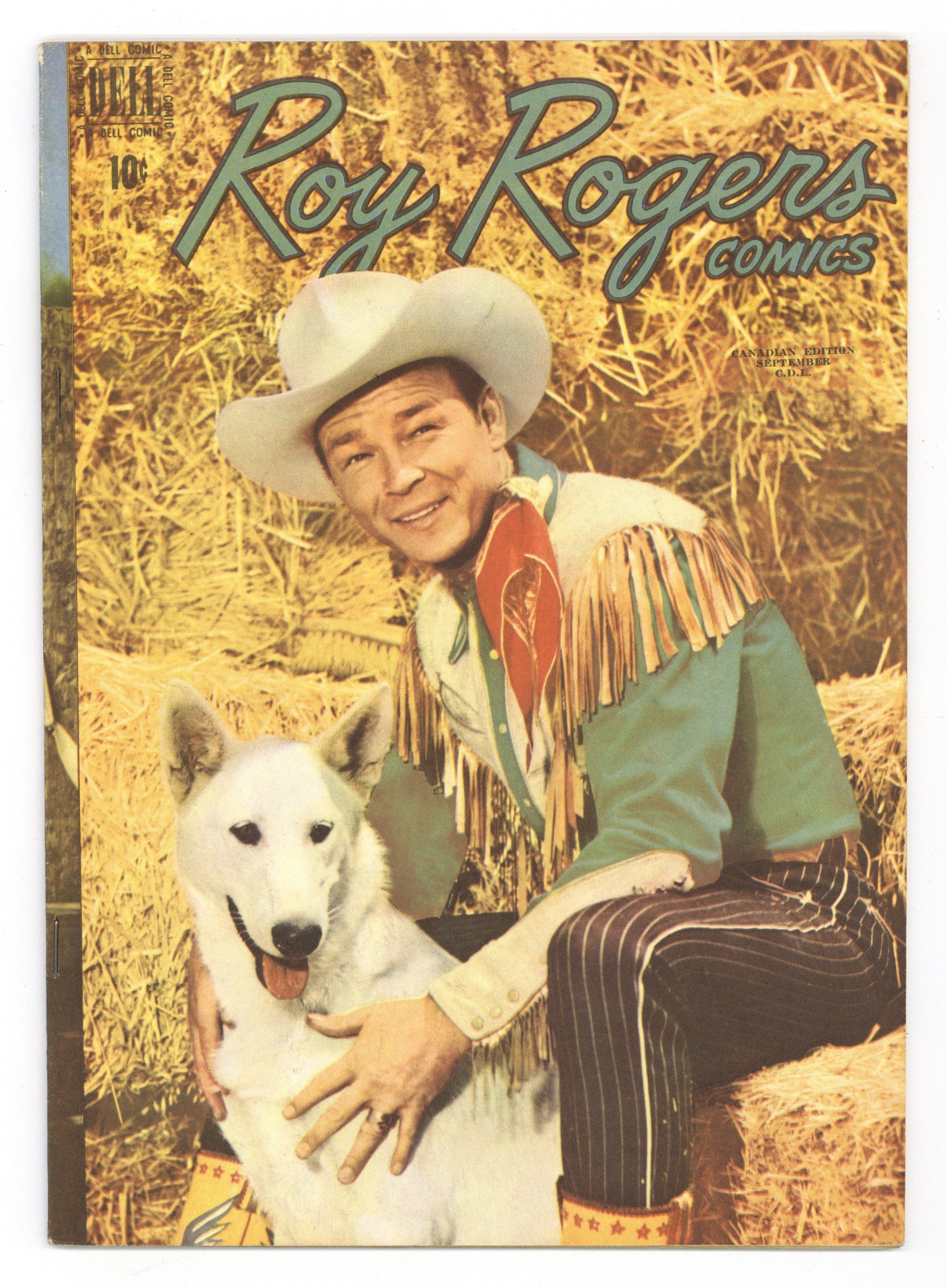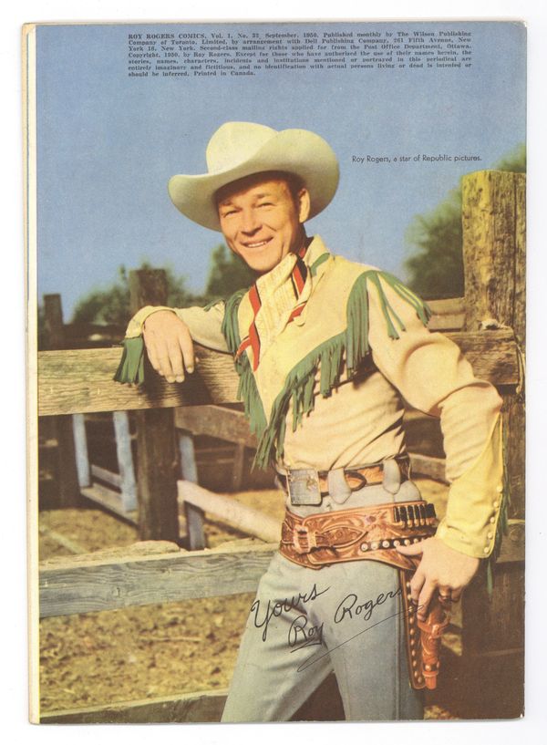 Published May 1948 by Wilson Publishing.$60.00Canadian Edition. Photo front and back cover of the famous singing cowboy, plus interior photos. Roy Rogers and the Ghost of the Lost Galleon, script by Gaylord DuBois, art by Albert Micale; a story centered on the ghost of an old prospector. Johnny Owens-Poison to Outlaws--Great Lawmen of the Old West, script by Gaylord DuBois, art by Albert Micale. Untitled Chuckwagon Charley's Tales story, script by Gaylord DuBois, art by Harry Parks (Parkhurst). 36 pgs. $0.10. Cover price $0.10.