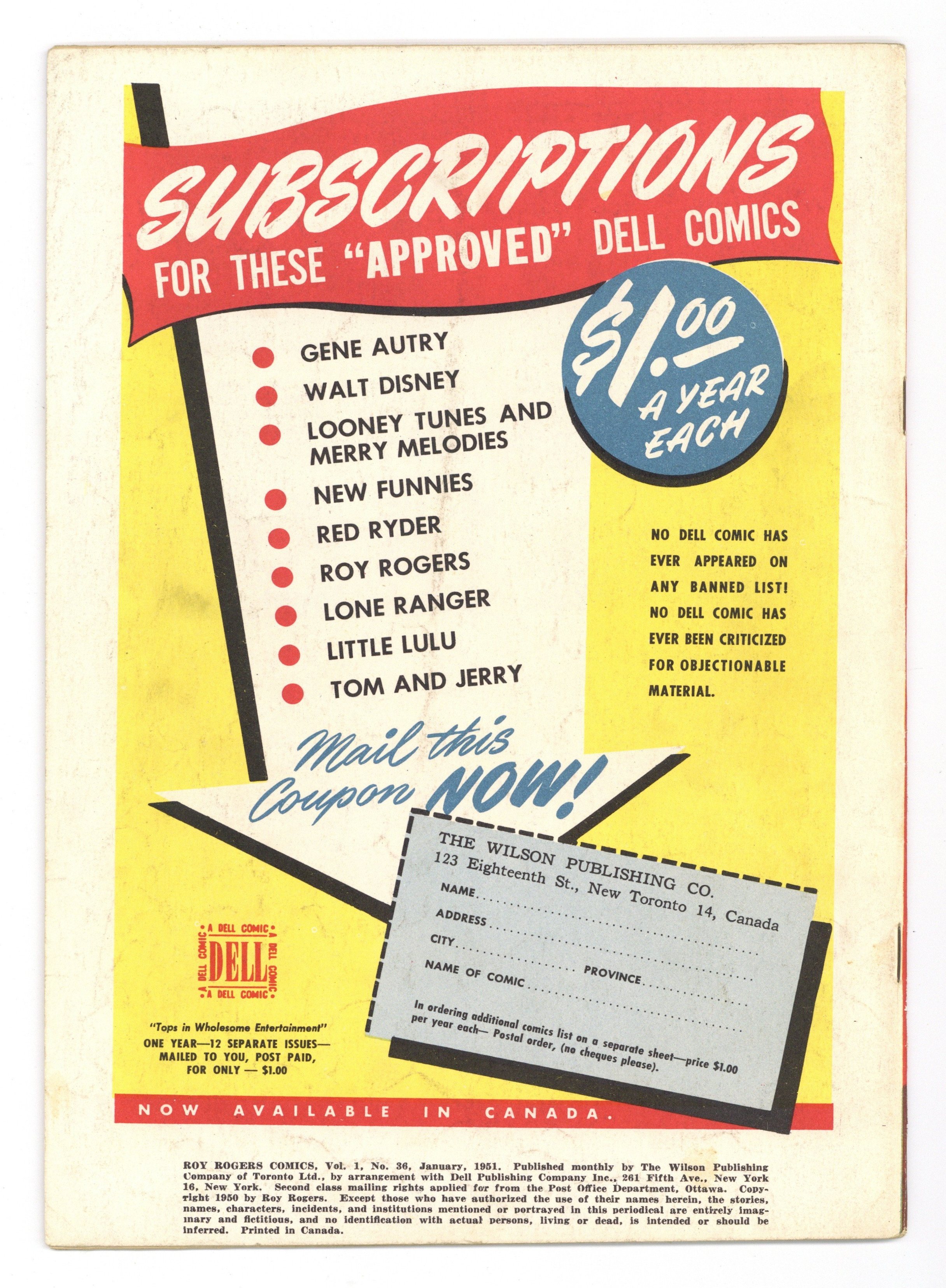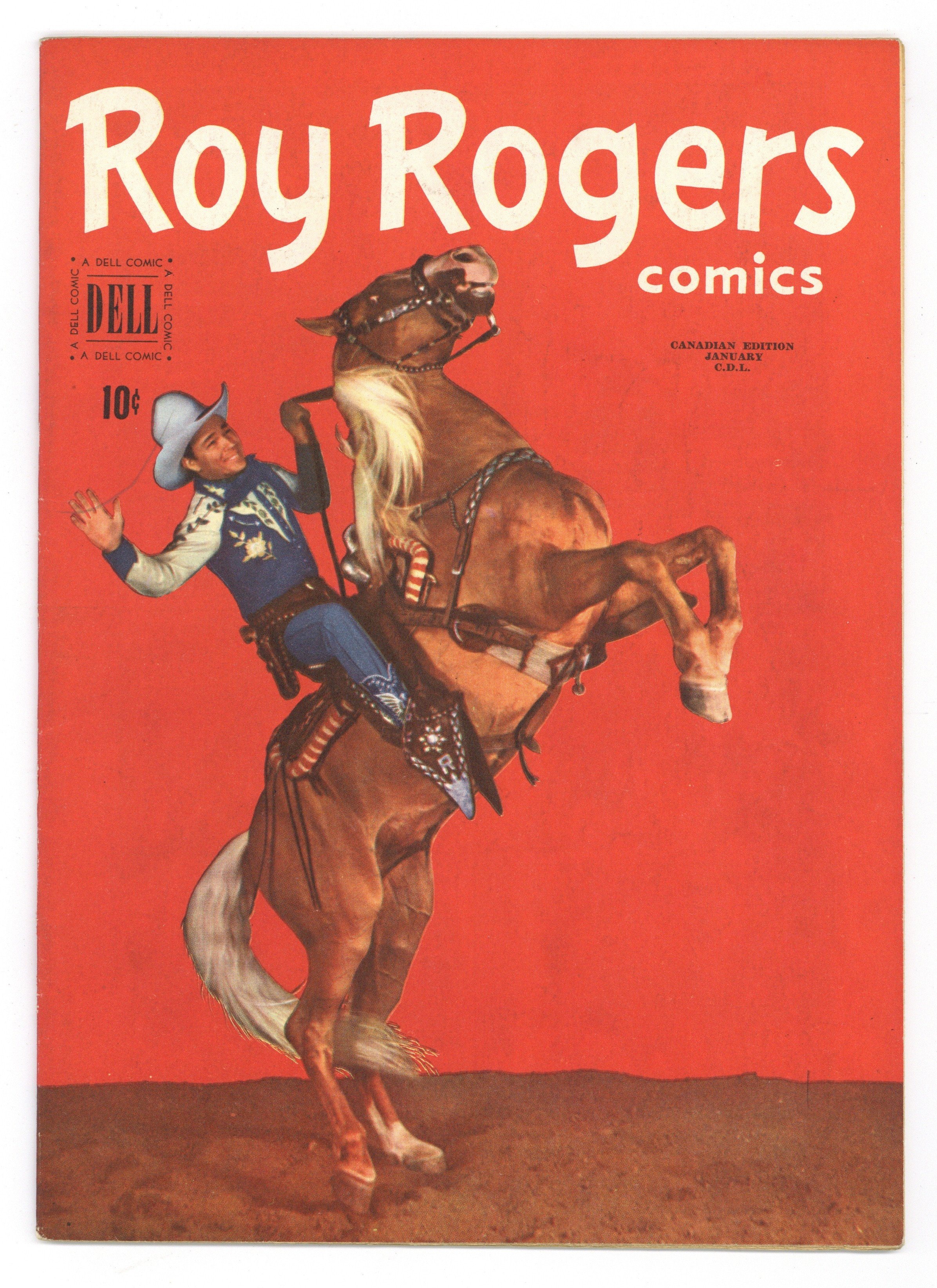 Published May 1948 by Wilson Publishing.$50.00Canadian Edition. Photo front and back cover of the famous singing cowboy, plus interior photos. Roy Rogers and the Ghost of the Lost Galleon, script by Gaylord DuBois, art by Albert Micale; a story centered on the ghost of an old prospector. Johnny Owens-Poison to Outlaws--Great Lawmen of the Old West, script by Gaylord DuBois, art by Albert Micale. Untitled Chuckwagon Charley's Tales story, script by Gaylord DuBois, art by Harry Parks (Parkhurst). 36 pgs. $0.10. Cover price $0.10.