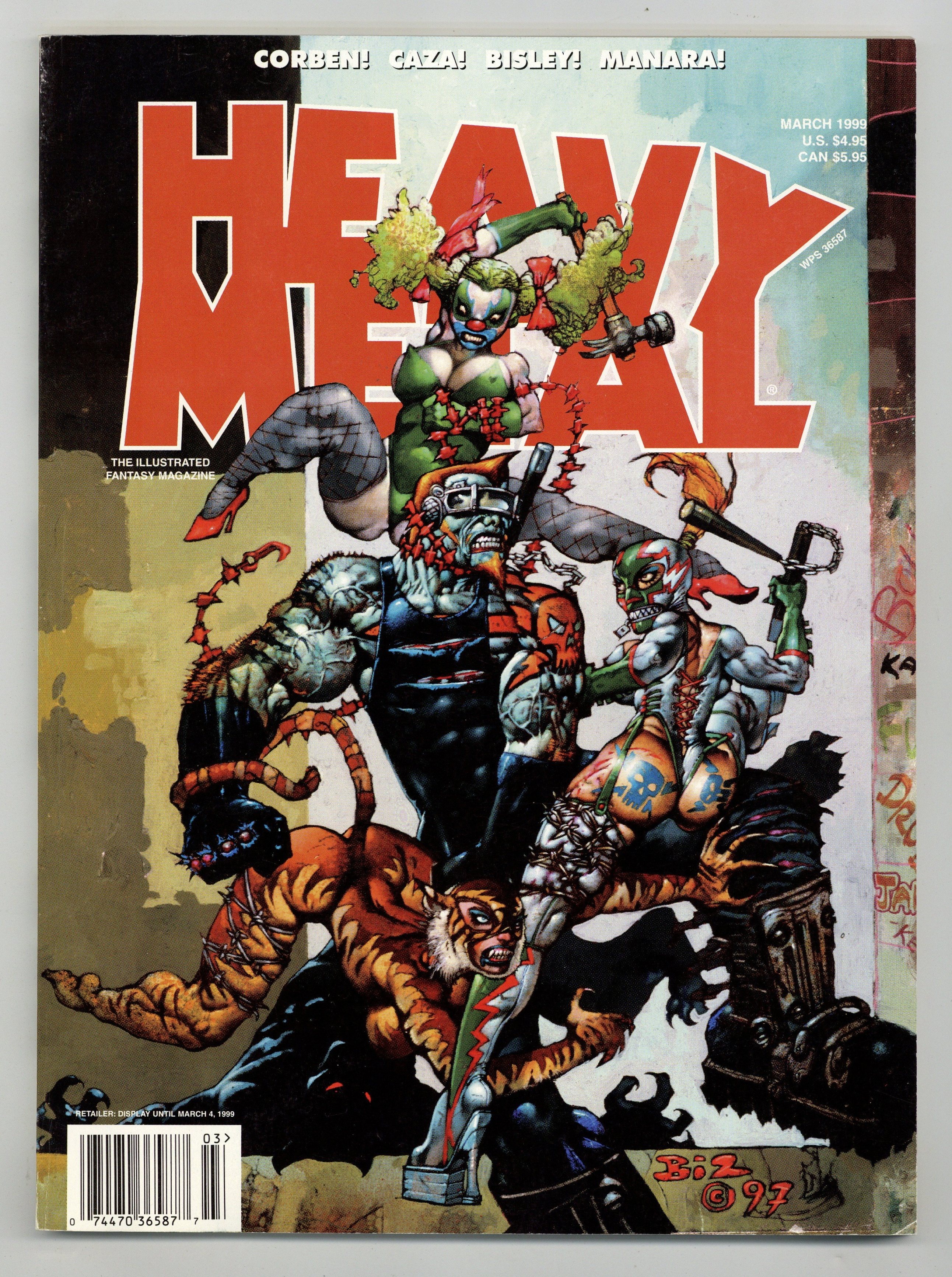 Published Mar 1999 by HM Communications.$14.25Bisley cover, Corben, Caza, Bisley, Manara, March 1999, issue 180. Dubbed "The adult illustrated fantasy magazine," Heavy Metal also publishes tales of horror, science fiction, and adventure. This issue includes the following stories: Fantasies by Milo Manara; Storm - The Slayer of Eriban by Don Lawrence and Martin Lodewijk; We Don't Need a Thirsty Hero! by Morvan, Buchet, and Color Twins; Flopi - The Fascination of Television by Carlos Trillo; Galactic Geographic by Karl Kofoed; The Rats in the Walls by Richard Corben; Ari-L by Caza; Simon Coldwater by Simon Bisley; The Pill by Yacine Elghorri; G-Squad by Morvan, Buchet, and Color Twins; and Flopi - Incomprehensible by Carlos Trillo. Includes Dave Leri art gallery. Cover art by Simon Bisley. Cover price $4.95.