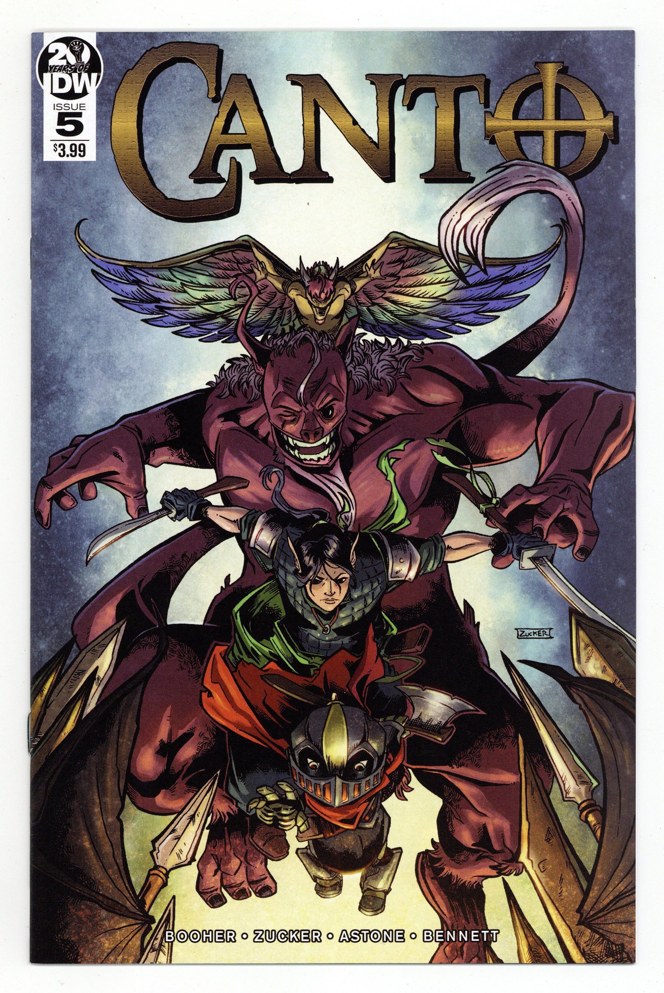 Written by David M. Booher. Art and Cover by Drew Zucker. Death from above! The Emerald Tower and the Shrouded Man are within reach, but three vicious Furies block Canto's way. Canto battles them bravely with his ax, but can he fight them... in his mind? 28 pages, full color. Cover price $3.99.