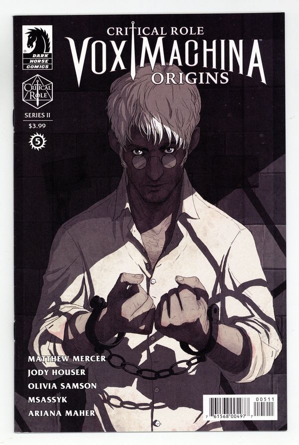 Published Feb 2020 by Dark Horse.$15.00Written by Jody Houser. Art by Olivia Samson and Msassyk. Cover by Will Kirkby. Let the nightmare begin! Or rather, manifest. Keyleth, Pike, and Scanlan have journeyed to the Umbra Hills to find the skull of a nightmare. Grog's survival depends on their success (no pressure), but the cult that has supposedly been conjuring the magical beast is nowhere to be found! Unless, of course, the mysterious stranger in the local jail is right, and the nightmare cult members are right under Vox Machina's nose! 28 pages, full color. Cover price $3.99.