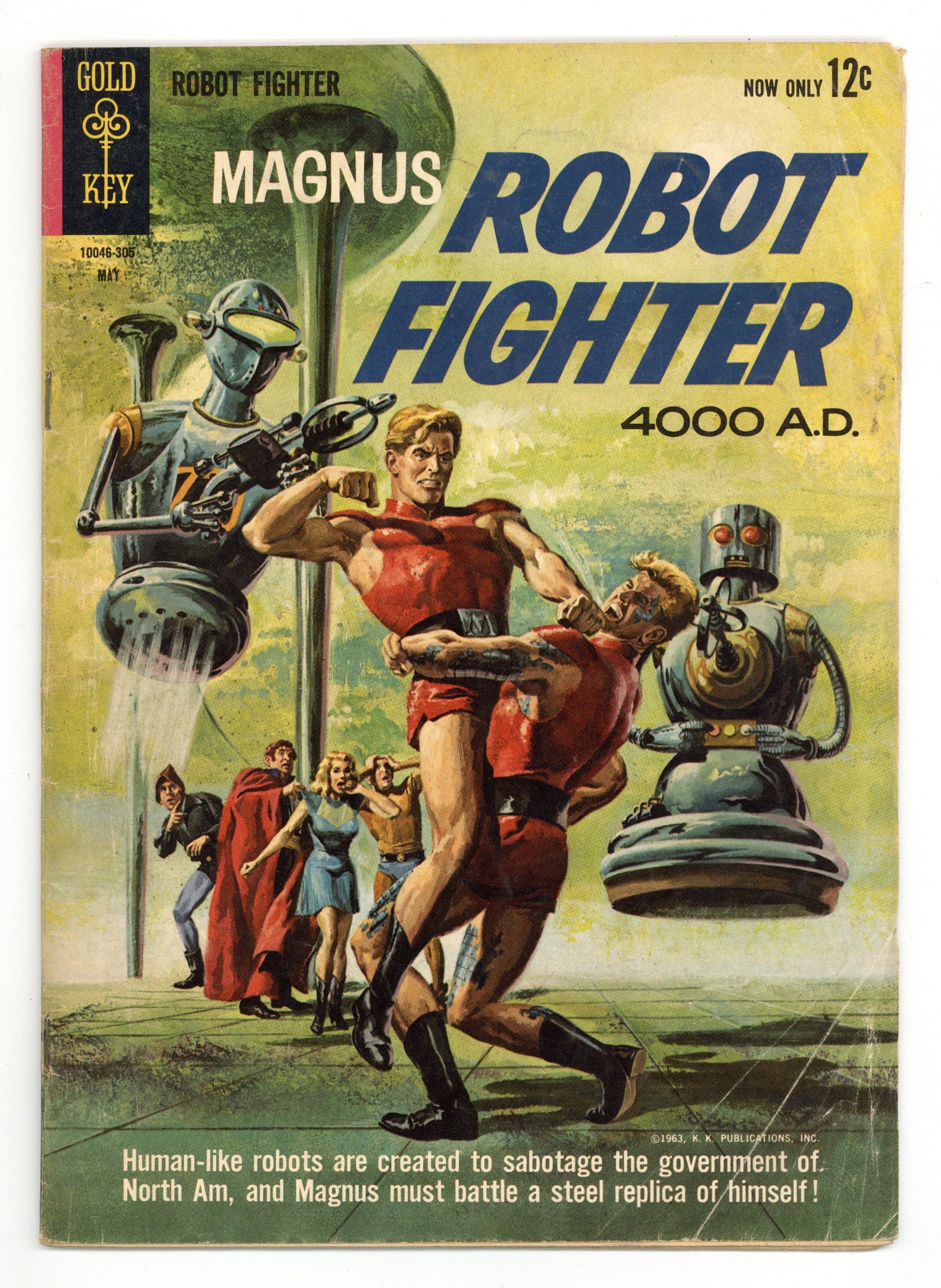 Painted cover art by George Wilson. "Trees, Number 7: Palms" article. "Operation Disguise," script by Russ Manning, Robert Schaefer, and Eric Freiwald, art by Russ Manning; Human-like robots are created to sabotage the government of North Am, and Magnus must battle a steel replica of himself. "The World of Robots... Today!" article. "Space Derelict," script by Robert Schaefer and Eric Freiwald, art by Russ Manning; An Earth-bound ship raises shields against meteors and finds a derelict Earth ship; Captain Johner goes aboard, finds air, but is hit from behind; Rodg and an Alien Og venture aboard; Rodg is struck down but Og grabs the perpetrator: an Earthman driven mad by loneliness. "Trees, Number 8: Cedar" article, art by Jack Sparling. Robot Fighter Pin-Up No. 2 back cover painting by George Wilson. # on cover 10046-305. May. #2 5/63. 36 pgs., full color. Cover price $0.12.