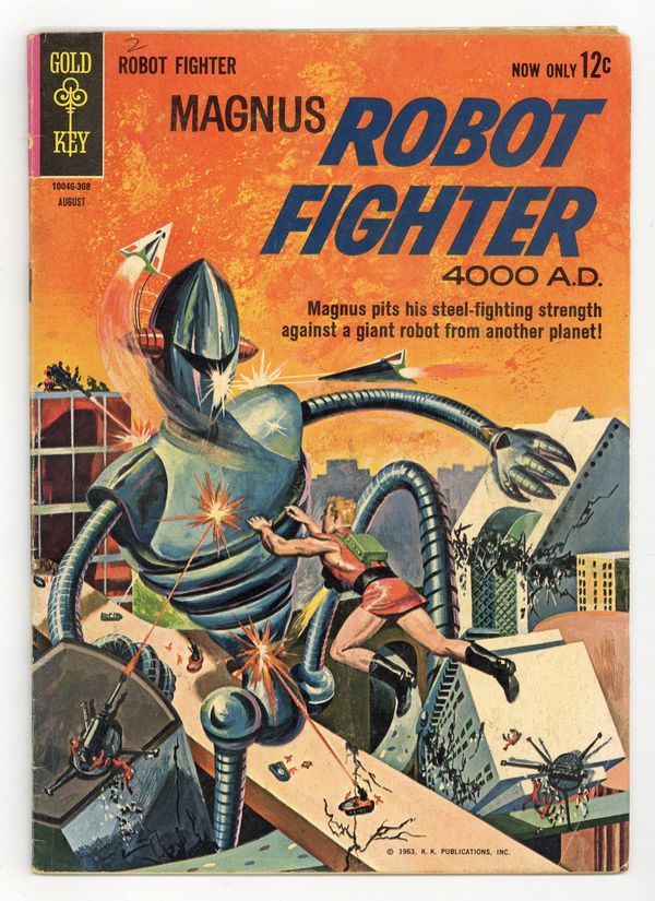 $33.00Painted cover art by Russ Manning. "Atomic Energy, Number 1: Identifying the Atom" article. "Giant from Planet X," script by Robert Schaefer and Eric Freiwald, art by Russ Manning; Magnus pits his steel-fighting strength against a giant robot from another planet. "A Matter of Judgment," script by Robert Schaefer and Eric Freiwald, art by Russ Manning; Aboard the Earth-bound ship, Captain Johner teaches Zarz how the ship runs; Two crewmen object to the "creatures" and distrust them; Later the ship is attacked by (some unknown ship's) missiles. "Atomic Energy, Number 2: The Composition of the Atom" article. Robot Fighter Pin-Up No. 3 back cover art by Russ Manning. # on cover 10046-308. August. #3 8/63. 36 pgs., full color. Cover price $0.12.