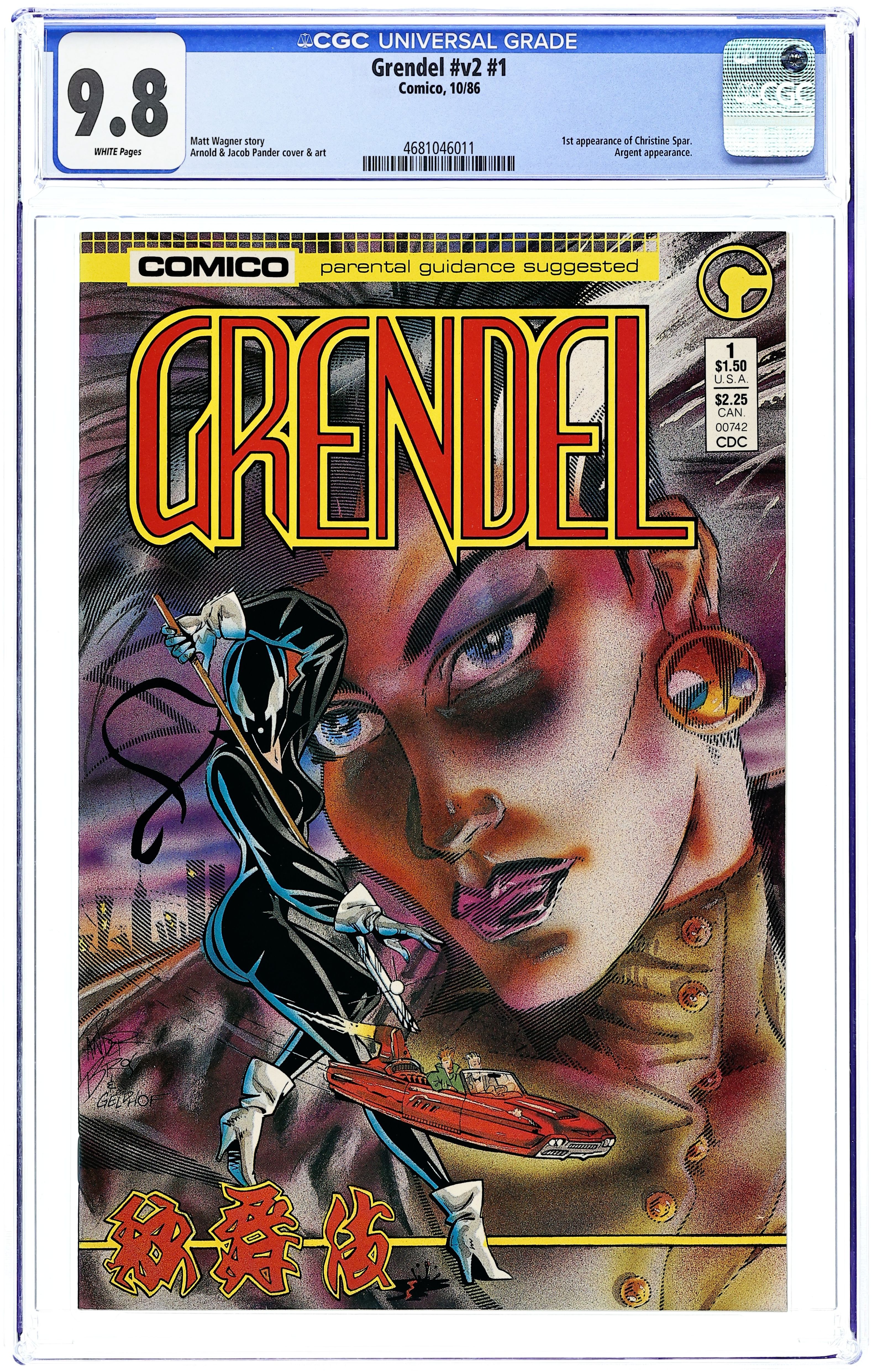 First printing. Direct Edition. 2nd printing exist for issues 1 and 2. Script by Matt Wagner, Pencils by Arnold and Jacob Pander, Inks by Jay Geldhof Grendel is dead, long live Grendel! With Hunter Rose, the original Grendel, dead, killed by the Man-Wolf Argent, the Grendel Legacy must find others to carry on its name. Follow the heritage of Grendel as it transforms every day people into Machiavellian schemers and assassins. In this issue: Devil in Response! Christine Spar, author of Devil by the Deed and daughter of Stacy Olliver (Hunter Rose's adopted daughter) is forced to take up the mantle of Grendel when a macabre Kabuki performer kidnaps her son! Will Argent hunt this new Grendel as he did the old? Cover price $1.50.