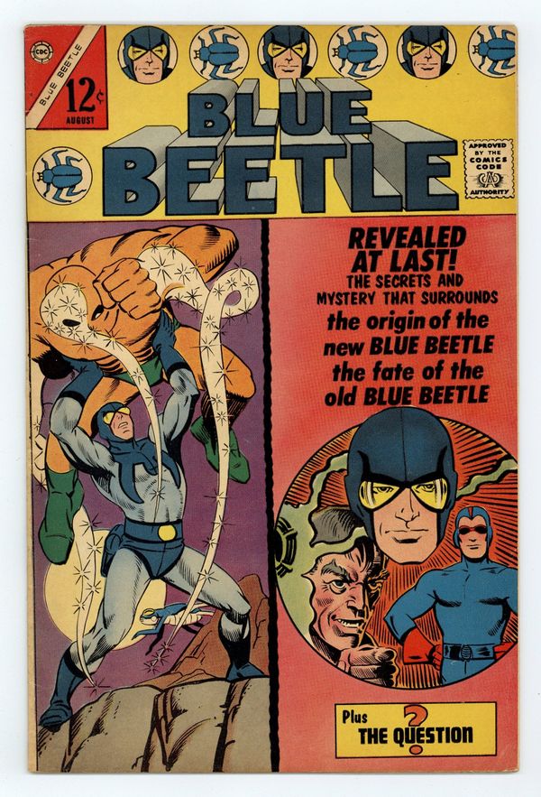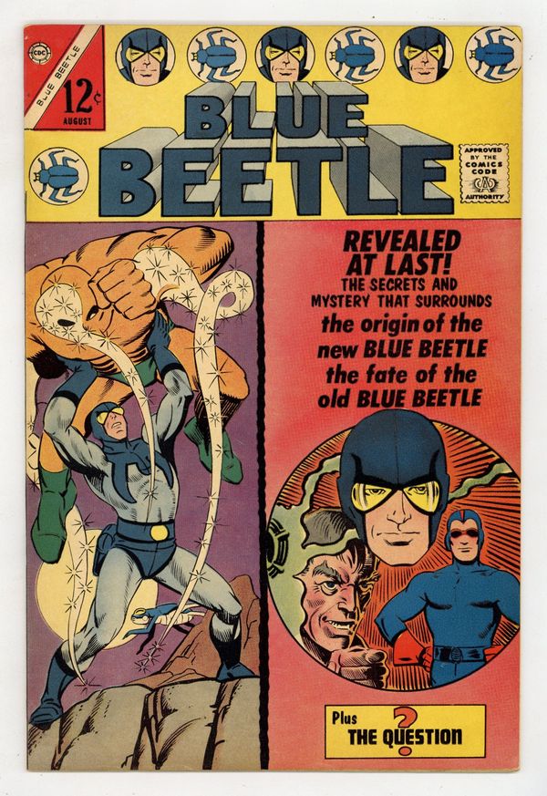 Cover by Steve Ditko. Stories and art by Steve Ditko, David Charles Glanzman and Dick Giordano. The third (or fourth, depending on how you count it) Charlton series to feature the Blue Beetle introduces the Silver Age BB, Ted Kord. The origin of the new Blue Beetle is revealed, as well as his connection to Dan Garrett, the Golden Age Blue Beetle. (Both heroes inspired characters in Alan Moore's Watchmen, as did The Question.) The faceless crimefighter The Question must find a way to silence the sinister Banshee. The End Is a Beginning!; The Question vs. the Banshee. 32 pages, Full Color. Cover price $0.12.