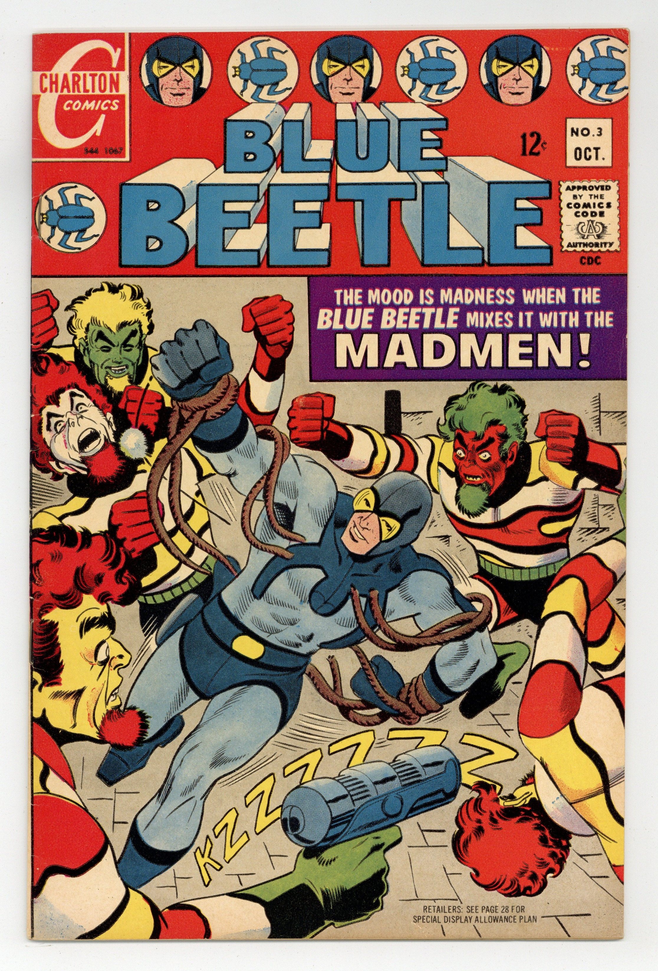 Published Oct 1967 by Charlton Comics Group.$15.00Cover by Steve Ditko. Stories and art by Steve Ditko, David Charles Glanzman and Dick Giordano. The third (or fourth, depending on how you count it) Charlton series to feature the Blue Beetle introduces the Silver Age BB, Ted Kord. The Blue Beetle battles the criminal gang known as the Madmen, whose fashion sense presages DC's The Creeper (another Ditko creation). The Question investigates a murder at a square construction. The Madmen; The Question. 32 pages, Full Color. Cover price $0.12.