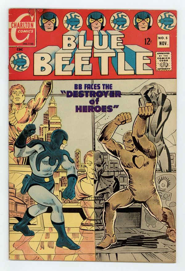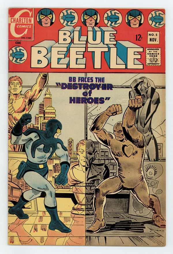 Cover by Steve Ditko. Stories and art by Steve Ditko, David Charles Glanzman and Dick Giordano. The third (or fourth, depending on how you count it) Charlton series to feature the Blue Beetle introduces the Silver Age BB, Ted Kord. In a two-part story, Blue Beetle joins forces with his back-up co-star (and fellow Ditko creation/Watchmen inspiration) The Question, as they take on the menace ominously named the Destroyer of Heroes. The Blue Beetle Faces the Destroyer of Heroes; Prisoner 22; The Critic. Final issue of the series. 32 pages, Full Color. Cover price $0.12.