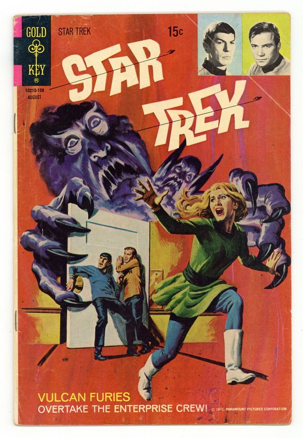Tags: Star Trek$25.00Comic book version of the original Star Trek TV series that starred William Shatner and Leonard Nimoy. Painted cover by George Wilson, with inset photos of William Shatner as Kirk and Leonard Nimoy as Spock. "The Brain Shockers," script by Len Wein, pencils by Angelo R. Todaro, inks by Alberto Giolitti; A dark secret from Spock's home planet threatens to destroy The Enterprise! Gold Key Kid tells a joke to introduce the Jokes on You feature. 36 pgs., full color. $0.15. Cover price $0.15.