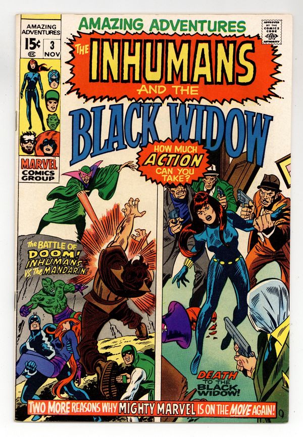 Cover pencils by John Buscema, inks by John Verpoorten. "Pawns of the Mandarin," script and pencils by by Jack Kirby, inks by Chic Stone; The Mandarin searches for the buried Eye of Yin and while the Inhumans rout his digging party, Black Bolt's curiosity becomes aroused and the Inhumans end up unwittingly uncovering the Eye of Yin for the Mandarin. "The Widow and the Militants," script by Gary Friedrich, pencils by Gene Colan, inks by Bill Everett; The Young Warriors occupy the building owned by Scarola. The mayor sends them a message but they ignore it; Meanwhile, the Black Widow is abducted by a masked man and his goons; Cameos by Peter Parker (Spider-Man) and J. Jonah Jameson. 36 pgs, full color. $0.15. Cover price $0.15.
